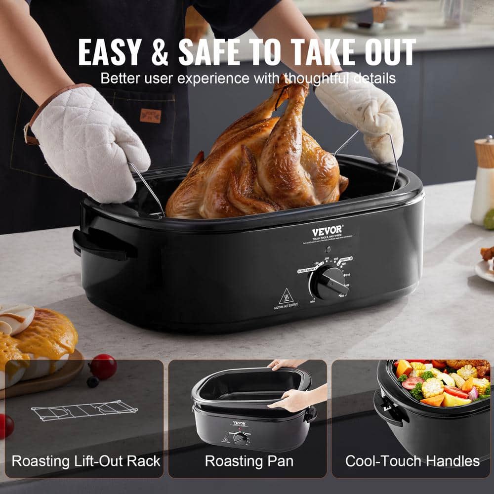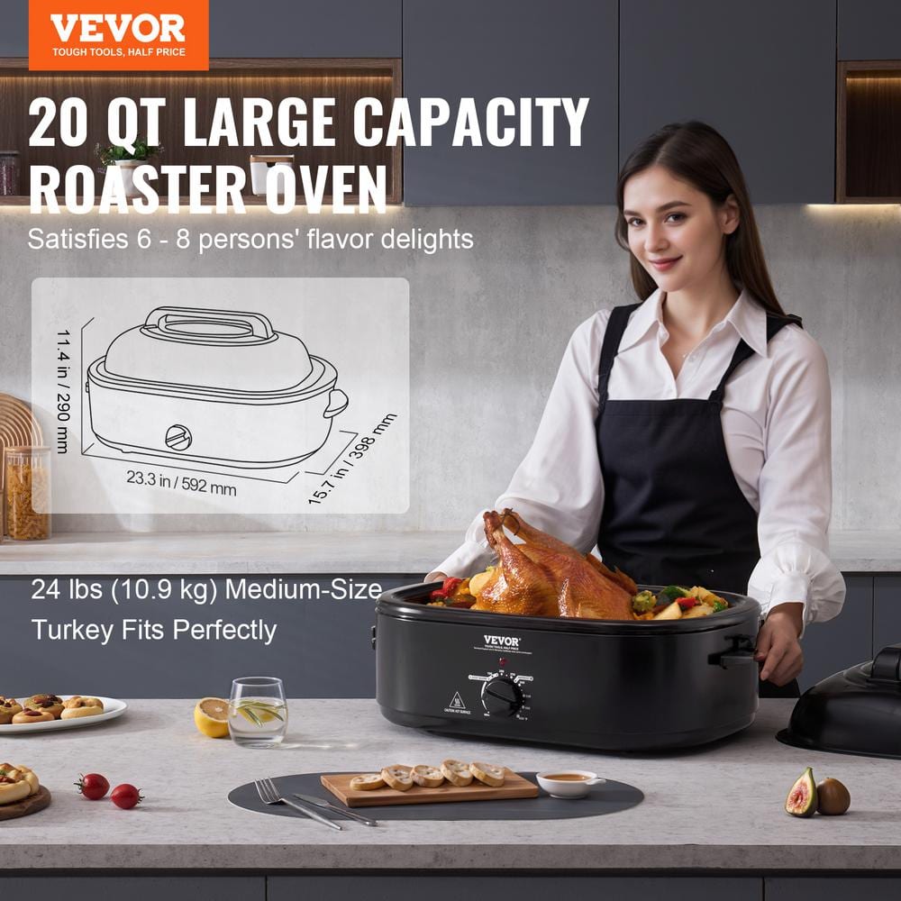 Electric Roaster Oven. VEVOR 20QT. electric roaster oven is your go-to appliance for roasting a browned turkey weighing up to 24 lbs., perfectly serving for 6-8 people, Its self-basting lid ensures even sauce distribution for tender and juicy results, while the wide temperature range meets various cooking needs.