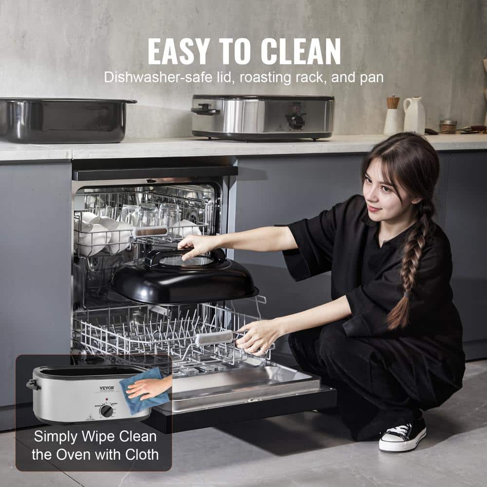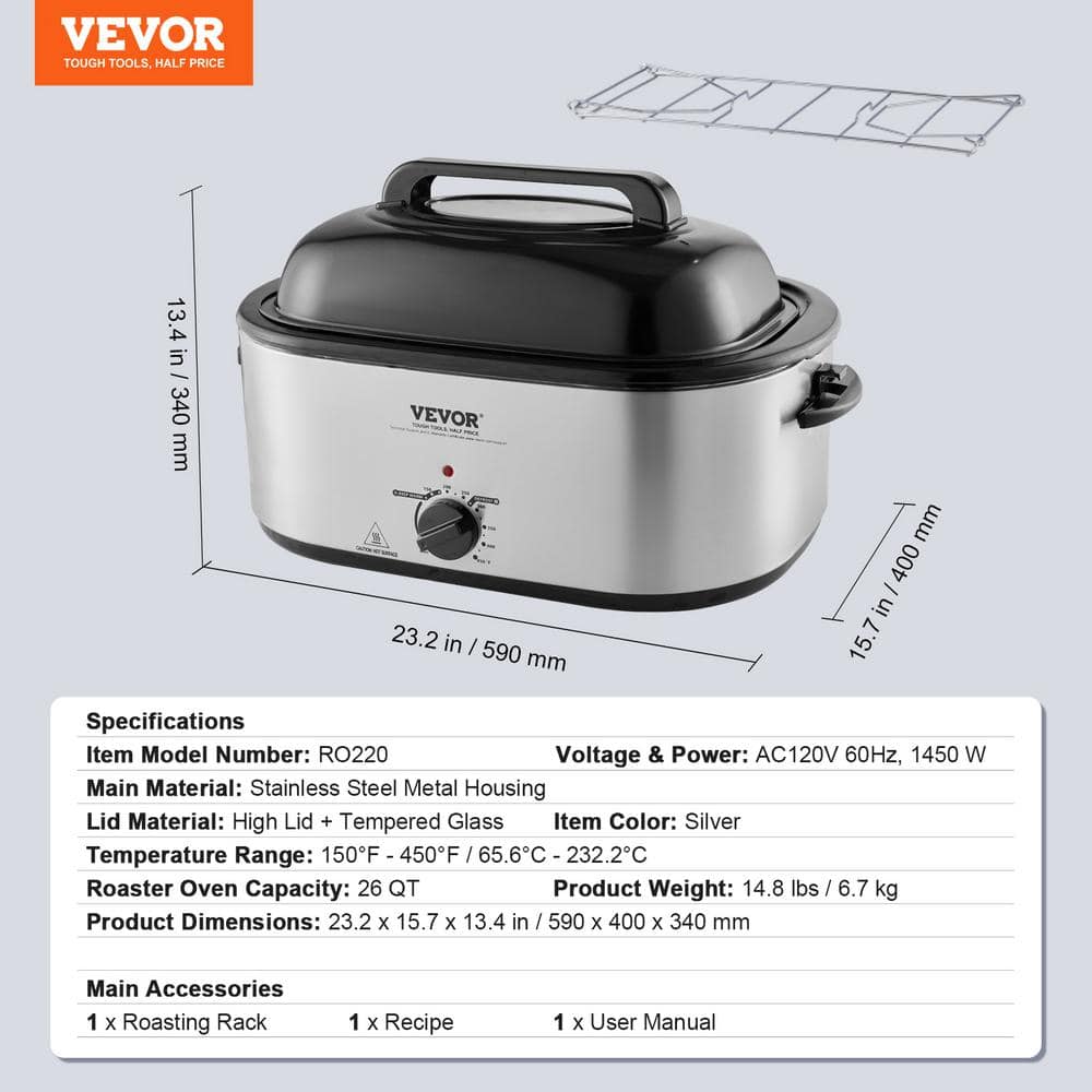 Electric Roaster Oven. VEVOR 26 qt. electric roaster oven is your go-to appliance for roasting a browned turkey weighing up to 30 lbs. perfectly serving for 12 or more people, Its self-basting lid ensures even sauce distribution for tender and juicy results, while the wide temperature range meets various cooking needs.