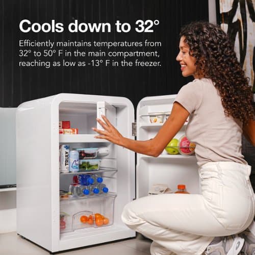 Upgrade your cooling experience with the Cooluli Curve 3.8. This sleek mini fridge is built in a one-piece metal cabinet and contains a separate freezer compartment . Features quiet operation, anti-vibration technology, and humidity control. Ideal for your home, office, or recreational area, the Curve 3.8 is where style meets functionality.