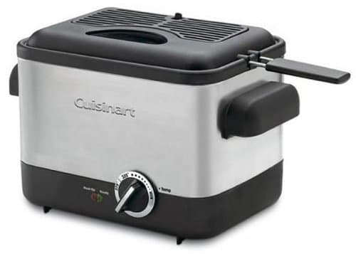 Cuisinart presents a deep fryer that takes up less counter space. Designed to fry batches up to ¾ of a pound in just 1.1 liters of oil, this is a great deep fryer even for spur-of-the-moment snacks and meals. The compact design allows creative cooks to prepare fried calamari to top a salad, and moms to fry up mozzarella sticks for kids. Temperatures up to 375°F and a die-cast frying bowl maintain selected oil temperatures for restaurant-quality results. Easy to use, easy to clean, and simple to store, it could make deep frying an everyday event!