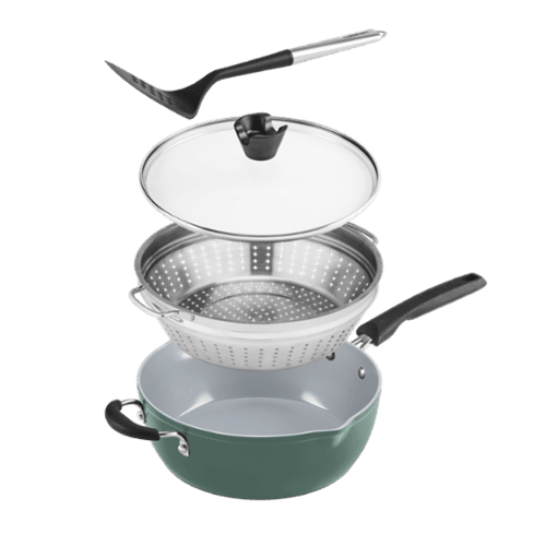 Meet the Preferred Pan – your ultimate culinary sidekick! Enhance your cooking with this versatile 4.5 Qt. capacity multi-purpose pan designed to perform at least 14 cooking tasks - poach, steam, strain, sauté, sear, fry, boil, simmer, sauce, braise, deglaze, brown, bake, roast. This pan features Cuisinart’s exclusive PURELYCERAMIC nonstick interior - manufactured without PFAS, ensuring it is free of PFOS, PFOA, and petroleum - for easy cleanup and is dishwasher safe. Lifetime warranty.