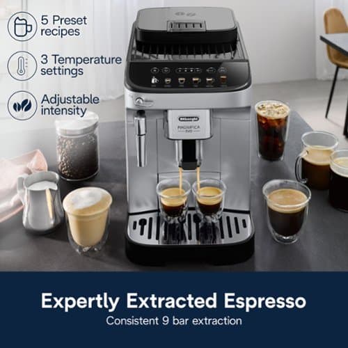 Bring the best of De’Longhi’s expertise and technology to your countertop, now more accessible than ever, with the new Magnifica Evo. Featuring 6 expertly crafted beverages, Magnifica Evo brings an authentic espresso experience to your home, at the press of a button. The one-touch display panel makes it easier than ever to enjoy espresso made right, right at home. The built-in conical burr grinder and brewing unit deliver only the freshest espresso with a perfect grind, dose, and brew every time, for the richest and most aromatic beverages that taste fresh from the cafe The traditional milk frother easily crafts espresso beverages with a long-lasting, silky-smooth foam—with milk or your favorite milk alternatives. Clean-up is simple thanks to our auto-clean function and detachable, dishwasher-safe design. Enjoy your favorite Italian espresso beverages from the comfort of your home with the exceptionally intuitive Magnifica Evo. Espresso made right is now just a touch away.