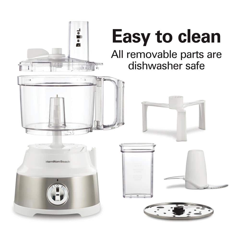 With the Hamilton Beach Bowl Scraper Food Processor, you'll save time because the built-in bowl scraper eliminates the need stop and scrape the bowl with a spatula. You can slice, shred, chop, mix and puree a wide variety of ingredients - the stainless steel slicing/shredding disc and chopping blade make it easy. The powerful 450 watt motor easily handles the toughest ingredients from carrots to Parmesan cheese, and the 2 speeds with pulse provide all the precision you need. For easy cleanup after processing, the 10 cup bowl, lid, slicing/shredding disc, chopping/pureeing blade and bowl scraper are all dishwasher safe. BPA-free in food zones for peace of mind and backed by a 1 year limited warranty from Hamilton Beach.