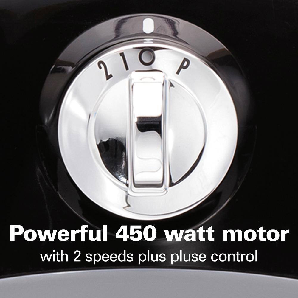 - 450-watt motor with 2 speeds and pulse control for efficient use