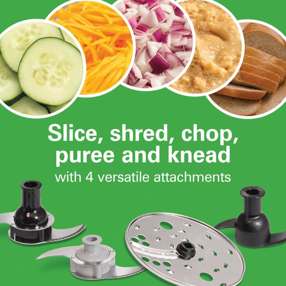 You'll love having the Hamilton Beach Stack & Snap Duo Food Processor in your kitchen, especially when you need to prepare multiple foods in one prep session. You can process large batches with the 14 cup bowl, plus it's sealed and has a pour spout to eliminate messy leaks. You'll appreciate having the 4 cup mini bowl around for smaller batches, and you'll reach for it every time you have a quick chopping task. Assembling this food processor is always easy because its unique stack and snap assembly eliminates difficult twisting and locking. To save you time and prep work, the Big Mouth feed chute fits whole foods. The Hamilton Beach Stack & Snap Duo Food Processor includes 4 versatile attachments to slice, shred, chop, mix, puree and knead every ingredient with ease. The 500 watt motor packs plenty of processing power, and the 2 speeds plus pulse provide all the control you need. The cord storage area hides the cord when not in use and reduces countertop clutter. For easy cleanup, the bowl, attachments and lid are dishwasher safe. All food zones are BPA-free.