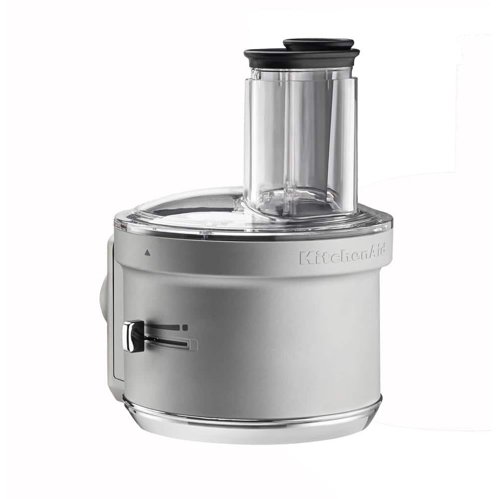 Add the Kitchen Aid KSM2FPA food processor attachment to your accessory collection. You will be able to attach it to the hub of your mixer stand and dice, slice, shred and julienne your favorite fruits, vegetables and hard cheeses. Plus, it includes a compact storage case designed to hold the dicing kit, plus the slice, shred and julienne blades. The exclusive ExactSlice system allows you to slice from thick to thin with one slide of the lever, and the wide feed tube accommodates various sizes of food for less prep work.