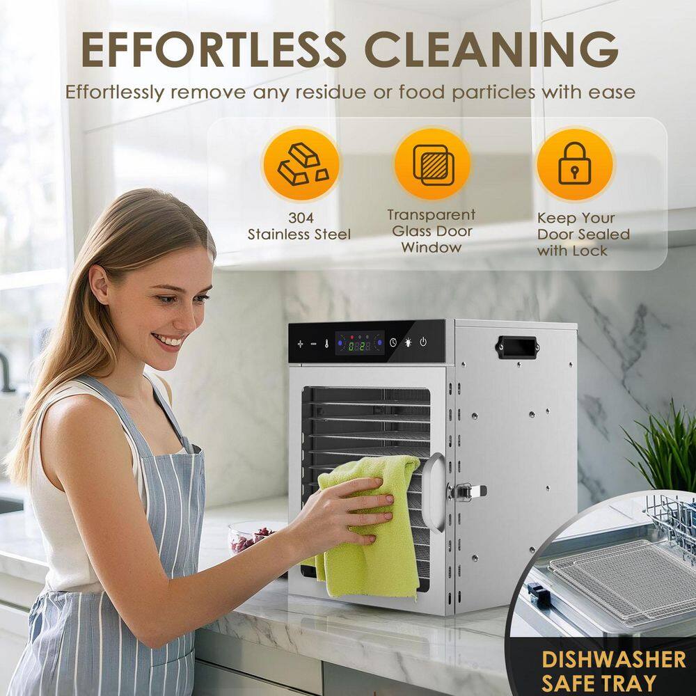 The SEEUTEK Food Dehydrator makes preserving your favorite foods easier than ever. With adjustable temperature settings (85°F to 195°F) and a customizable timer (up to 24 hours), you'll have complete control to dry fruits, vegetables, meats, and herbs to perfection. The dehydrator shuts off automatically once the timer completes, ensuring no over-drying.Designed for convenience, the SEEUTEK operates quietly at ≤45dB, making it ideal for nighttime use. The 12 stainless steel trays offer ample drying space, and the dual rear fans with 360° airflow provide fast, even drying-up to 30% faster than traditional dehydrators. Plus, its 304 food-grade stainless steel construction ensures durability and easy cleaning.This SEEUTEK Food Dehydrator comes complete with everything you need, including 12 trays, 1 handle, 1 fruit roll sheet, 1 drip tray, 1 silicone glove, 2 non-stick silicone sheets, and a recipe book. Perfect for families and health-conscious snackers!