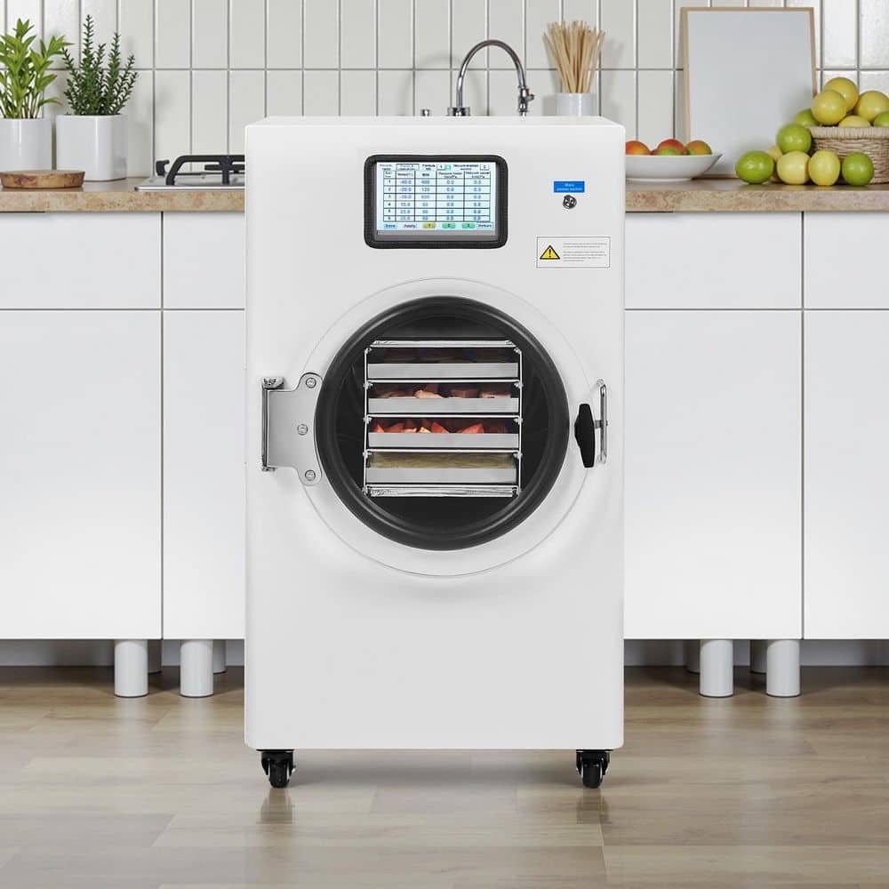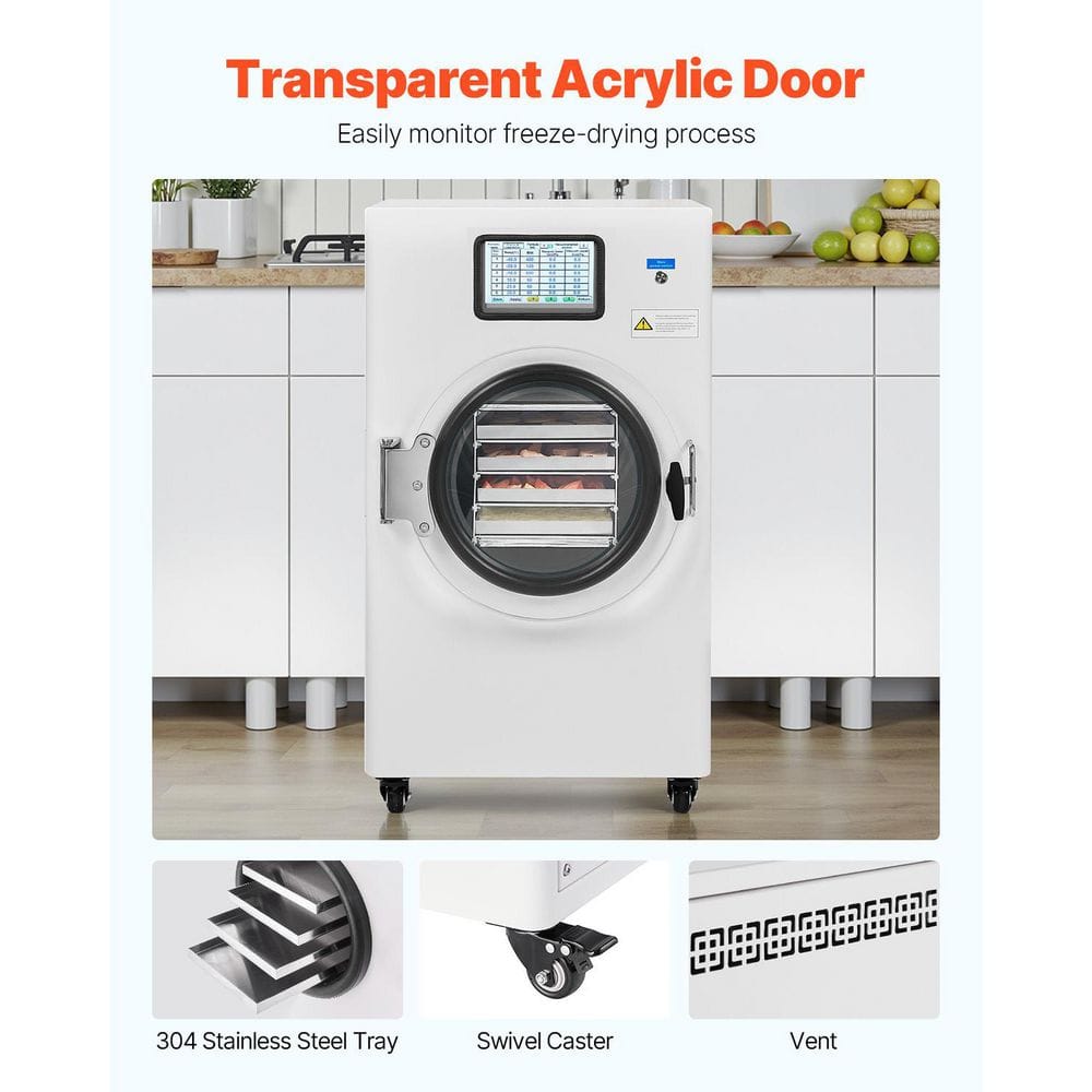 Vacuum Freeze Dryer Machine, Efficient & Reliable Food Preservation for Long-Term Storage. The freeze dryer offers a large capacity of 8.8-13.2 lbs. (4-6 kg), making it perfect for drying a wide range of foods; This machine uses advanced vacuum freeze-drying technology to retain the original flavor, color, texture, and nutrients of your food; Unlike traditional dehydration methods, freeze-drying helps preserve food for long periods without compromising its quality. Big Capacity, Efficient Freeze-Drying Technique, Intelligent Control System, Low Noise and Energy Conservation, Visualized Freeze-Drying Procedure.