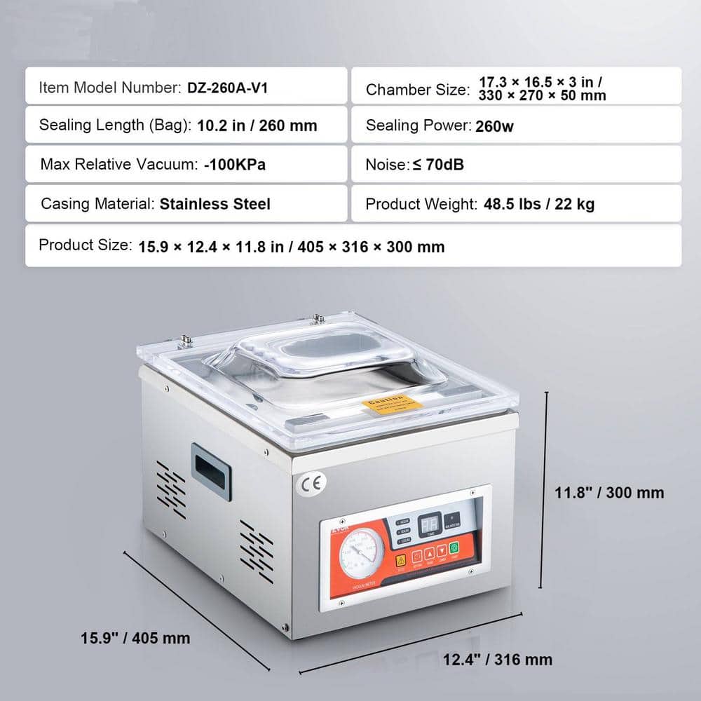 SVOPES Chamber Vacuum Sealer - Efficient Food Preservation Made Easy Elevate Your Food Storage The SVOPES Chamber Vacuum Sealer is designed to streamline your food preservation process. Whether you're sealing wet foods, meats, or marinades, this machine offers reliable and efficient performance for both home and commercial use. Powerful 260W Sealing: Ensures airtight packaging for optimal freshness. Generous 10.5 in. Sealing Length: Accommodates larger items and bulk packaging. Compact and Versatile: Ideal for home kitchens and commercial settings. User-Friendly Operation: Simplifies the vacuum sealing process with intuitive controls. Durable and Reliable: Built to withstand frequent use and provide consistent results.