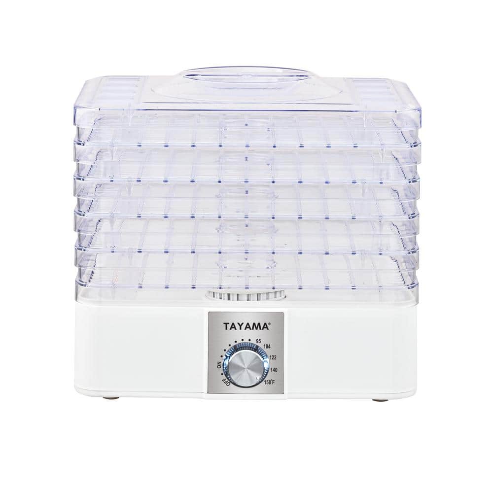 Enjoy nutritious, delicious and low-calorie snacks with the Tayama 5-Tray Food Dehydrator. The Tayama Food Dehydrator has 240 Watts of drying power to ensure you can dry more food, faster and easier. The adjustable temperature control (95°F -158°F) gives you the ability to achieve the best results when drying different foods that may require varying temperature settings. The air flow forces the heated air up into the 5 trays with no rotation needed, always keeping the air circulating and moving to provide optimal and consistent drying. Create healthy and fresh options to add to your breakfast, lunch, dinner or just a convenient snack. Each dehydrating tray is BPA free and provides plenty of drying space. Simply prep your desired fruits and vegetables, spices, herbs and even make all types of seasoned meats for jerky. Healthy preservation of food is important when you are looking to store food, retain the nutrients without the added chemicals, additives and preservatives. Cleanup is a breeze, each tray is dishwasher safe or simply hand wash with warm soapy water.