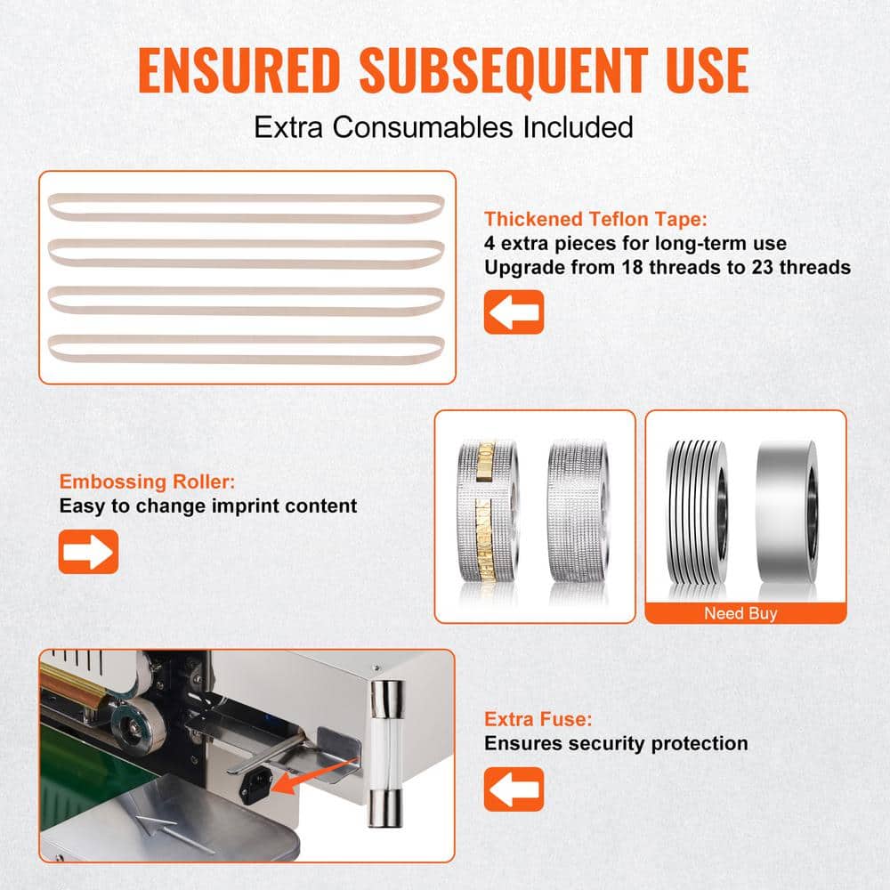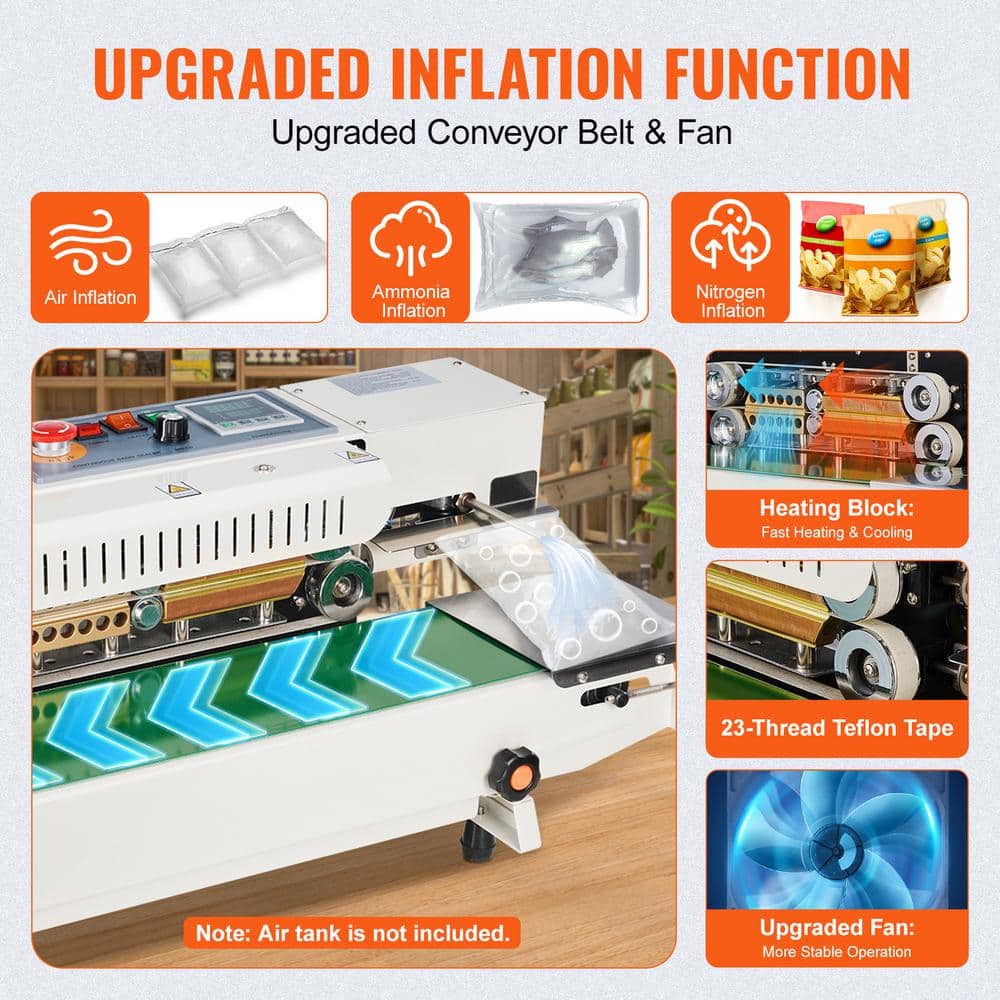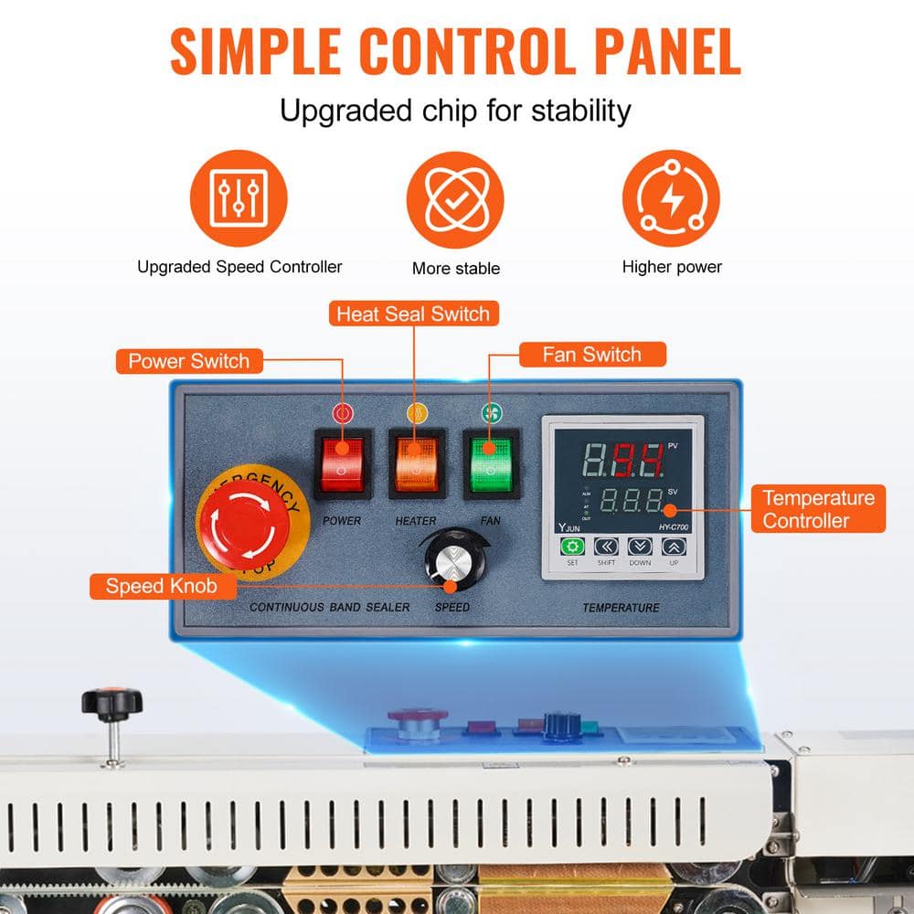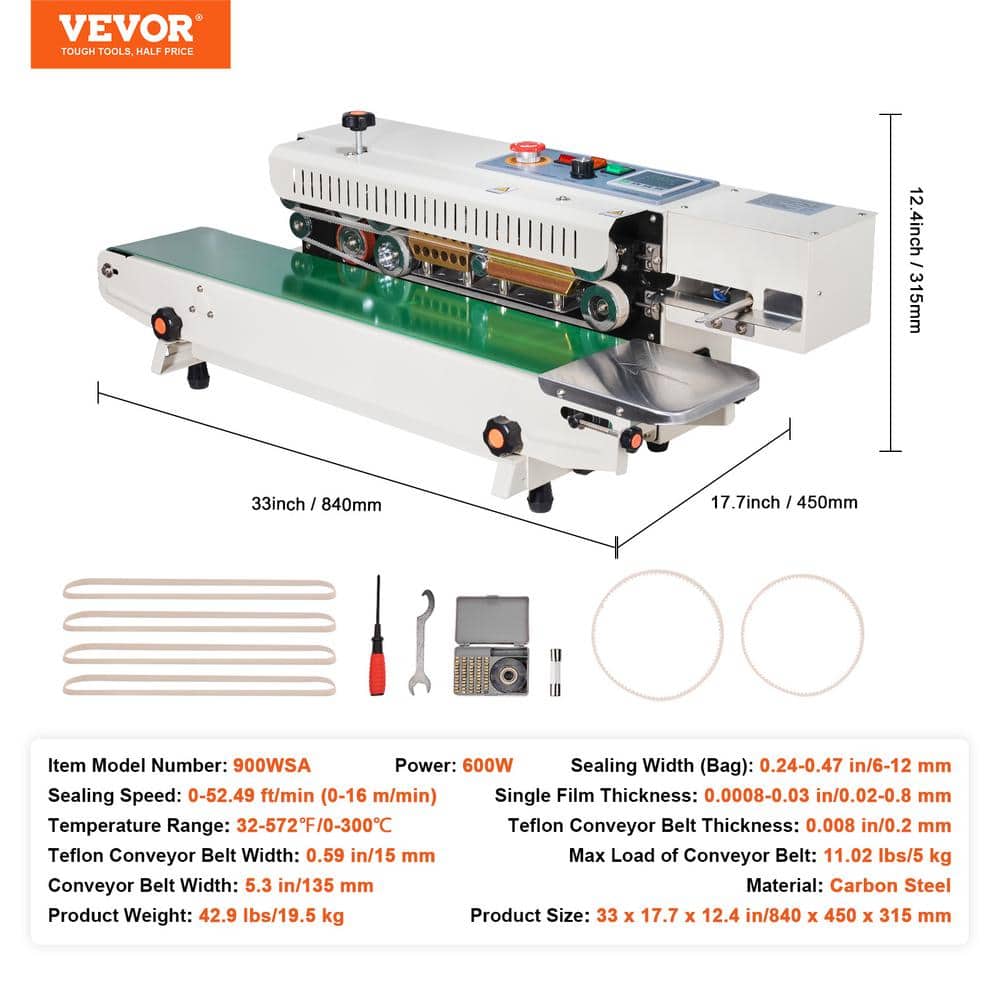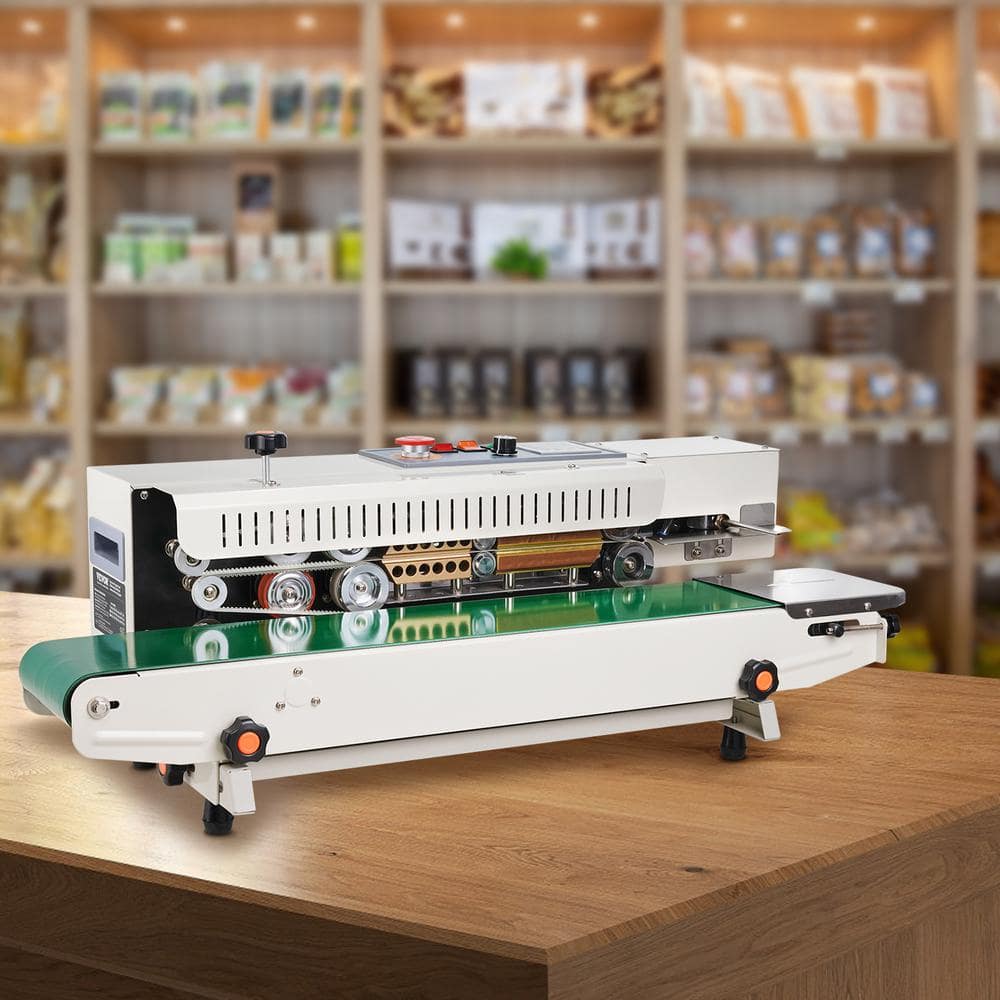 VEVOR Continuous Band Sealer. Designed for efficiency and reliability, our continuous sealing machine integrates sealing and cutting capabilities to streamline your packaging process. Ideal for a variety of materials and bag types, it provides secure seals and customizable printing options. Built with durability in mind, it ensures stable operation and easy maintenance, making it a versatile choice for enhancing your production line.