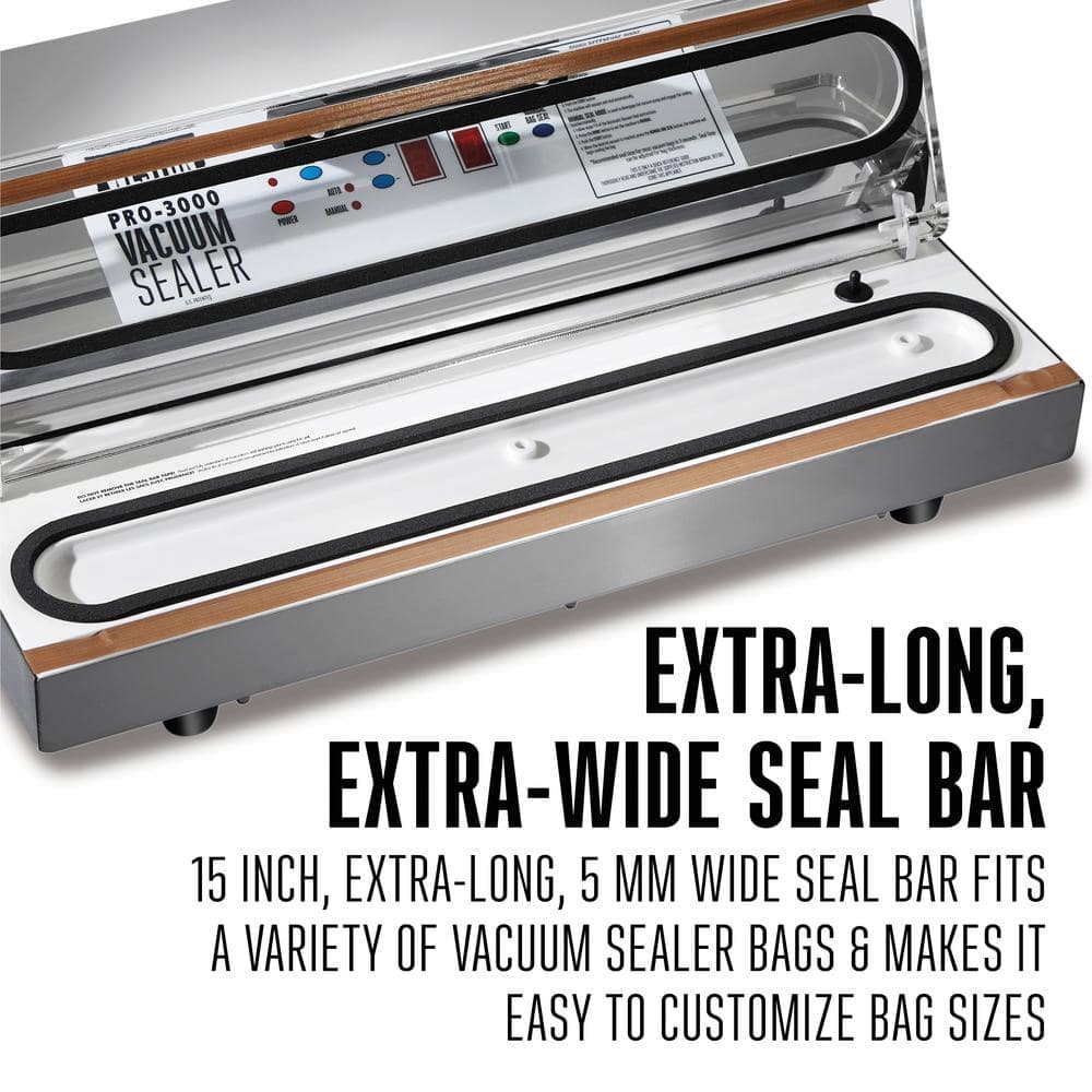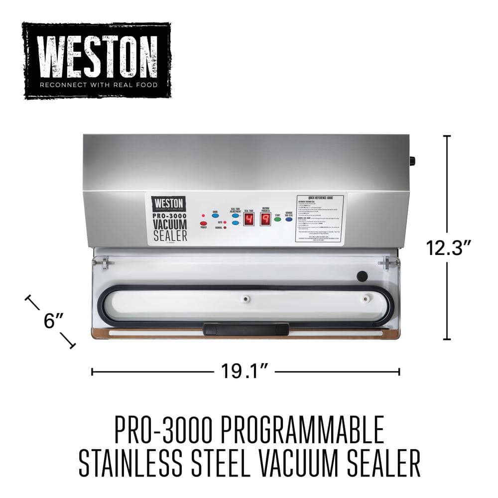 The Weston PRO-3000 Stainless Steel Vacuum Sealer is ideal for sealing your season's harvest, portioning out bulk beef, pork and lamb from a butcher or direct from a farm, and for sealing your fresh catch. This sealer features a digital, easy-to-use control panel, which helps you to monitor the stages of the sealing process and seal time, and has an extra-large sealing bar for sealing bags up to 15 in. wide. The PRO-3000 vac sealer also includes a double piston vacuum pump to deliver up to 28 in. HG vacuum strength. This model has an automatic mode with simple one touch operation and a manual mode allows you to control the amount of vacuum pressure for sealing sharp, delicate or moist foods and objects. The transparent acrylic lid allows for perfect bag alignment while sealing.