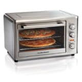 With 1500 watts of cooking power, the Hamilton Beach Countertop Oven with Convection & Rotisserie does everything your full-size oven does, while taking minimal space on your countertop. Whether you’re baking cakes, broiling fish or roasting an entire 8 lb. chicken, this oven has plenty of space — it's the ideal size for cooking family meals. The wide interior and two adjustable cooking racks provide double the space for cooking multiple foods at once, like two 12" pizzas. Cook a variety of foods to perfection. Bake, broil, roast on the rotisserie or use the convection setting to take your baking results to the next level. Convection bakes faster and more evenly than traditional ovens. The countertop oven is easy to use with simple dials to turn, yet it’s packed with convenient features. It has automatic shutoff, a 2 hour timer and a Stay On setting for foods that need extra cooking time. Easily create that store-bought rotisserie flavor at home. The revolving skewer revolves to lock in flavor and juices, while the outside of meat gets brown and crispy. The countertop oven includes: 2 oven racks, enameled bake pan/drip tray, rotisserie accessories and a slide-out crumb tray for easy cleanup.