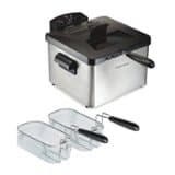 Get crispy, golden results in your own kitchen with the Hamilton Beach Professional-Style Deep Fryer. Inspired by commercial fryers, this easy-to-use home version features a large 4.7 quart (19 cup) oil capacity for frying up to 12 cups of food at the same time. With this large-capacity deep fryer, you can make batch after batch of restaurant-quality food without the messy splatter. For maximum versatility, it comes with 3 chrome-plated frying baskets, which let you fry 1 or 2 foods at the same time. Expertly prepare all your deep-fried favorites including french fries, chicken tenders, nuggets and wings, cheese sticks, onion rings, doughnuts, battered vegetables and much more — it's not only easier than using a pot on your stove, it's less messy. After frying, wash the removable heating element in warm, soapy water and dry. The enamel-coated oil pot, baskets and lid all go in the dishwasher for easy cleanup.