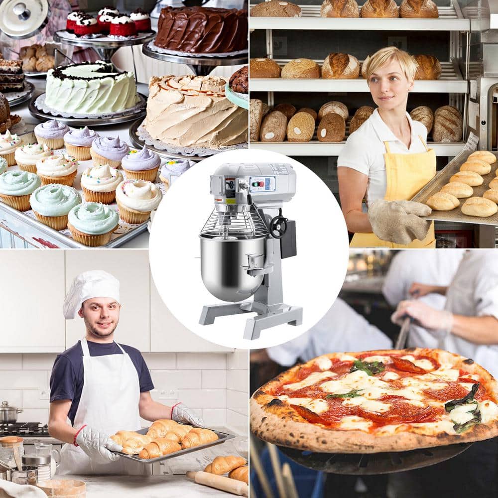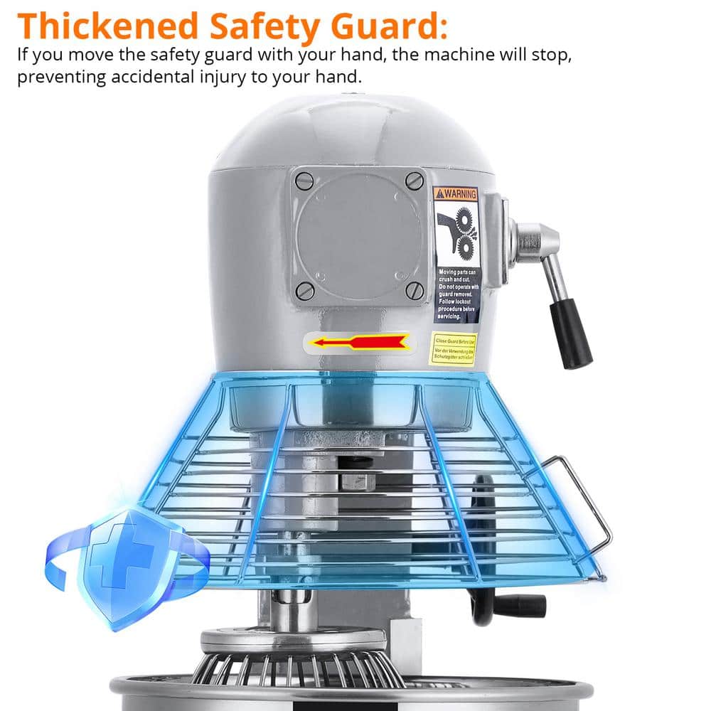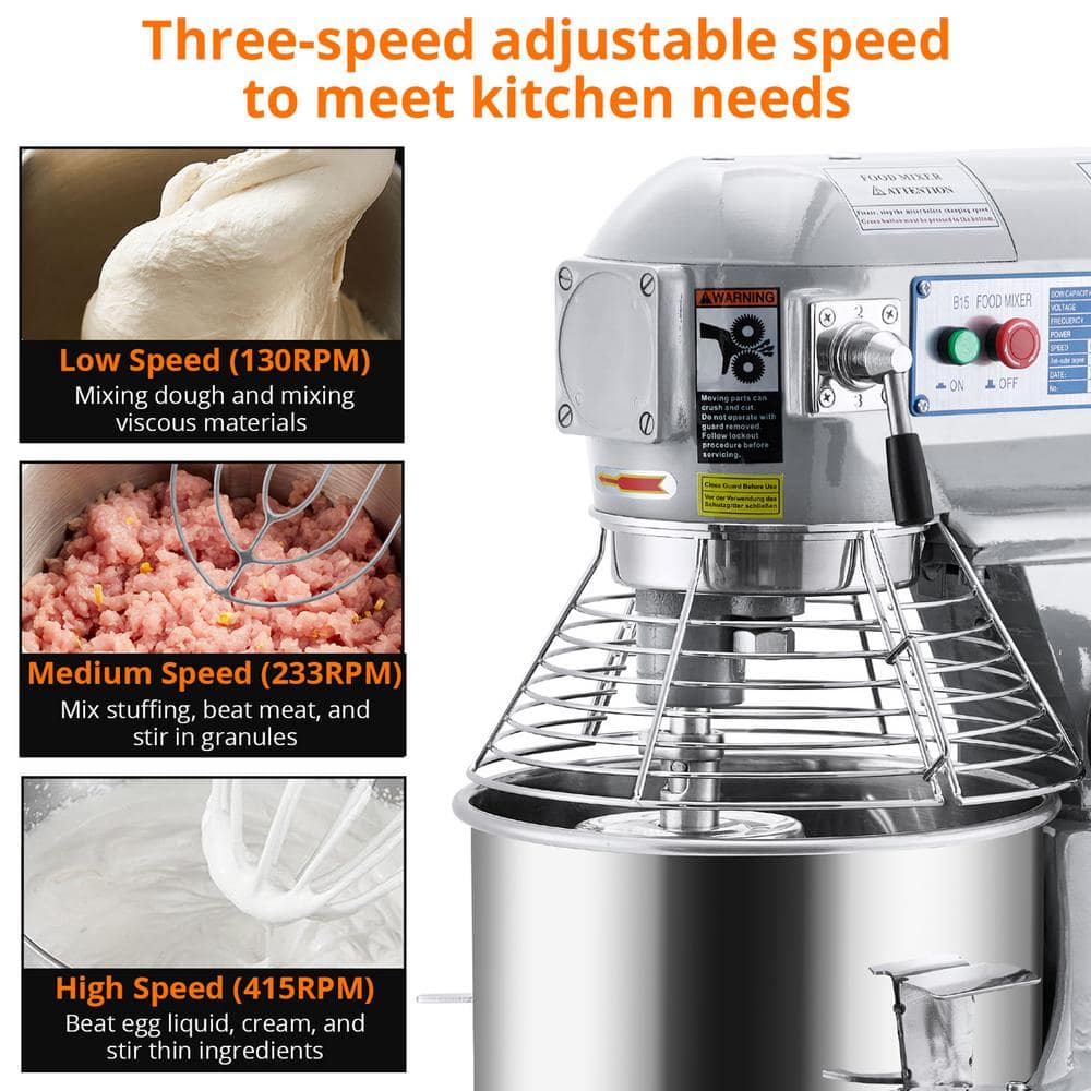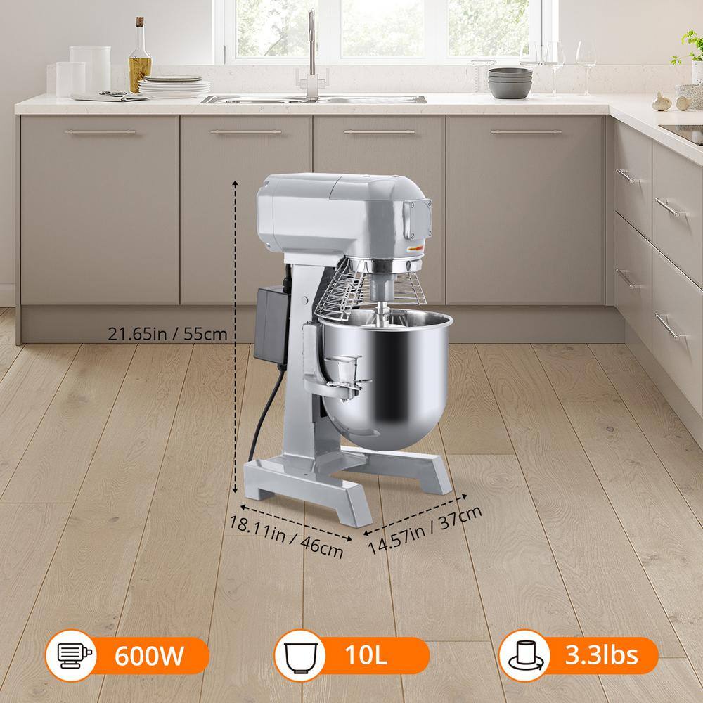 High Efficiency and Performance: Featuring a powerful 600 W motor, this commercial mixer delivers stable, hygienic performance. The 10 qt. mixing bowl has a generous capacity, easily accommodating up to 3.3 lbs. of dough in a single batch, making it perfect for high-volume tasks. Versatile Attachments: Includes 3 replaceable attachments: a spiral dough hook for heavy dough like a pizza, a flat beater for mashing and mixing batters, and a wire whip for aerating light mixtures such as whipped cream and egg whites. Each attachment is designed for optimal use at specific speeds. 3 Speed Settings: Choose from three-speed options (130 RPM, 233 RPM, 415 RPM) to suit various ingredients and mixing requirements. The gear-driven transmission ensures durability and reliability during operation. Safe Operation: Designed with a stainless steel wire bowl guard to prevent large items from falling into the bowl, this mixer ensures safe use. The bowl height is easily adjustable, and the START and STOP buttons operate independently for added security. Stable and Convenient Design: Equipped with fixed non-slip feet to minimize vibration and noise, this mixer ensures stable operation. It is widely used in bakeries, restaurants, pizzerias, commercial kitchens, and cafeterias, making it an essential tool for any food service establishment.