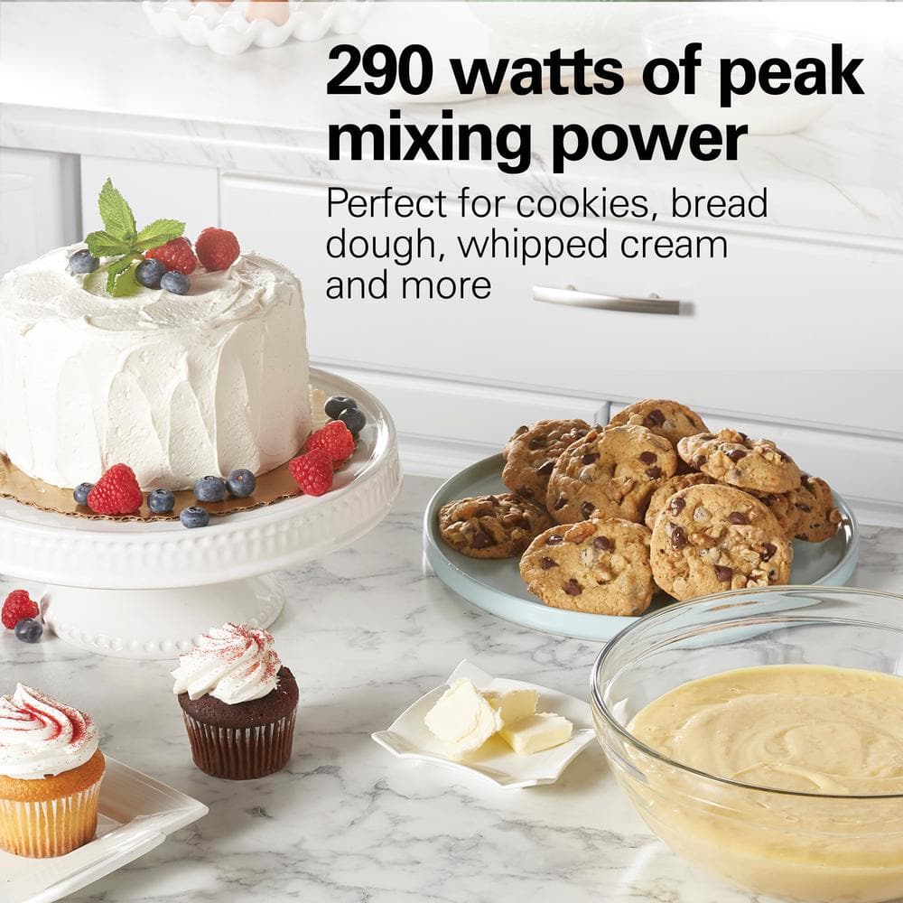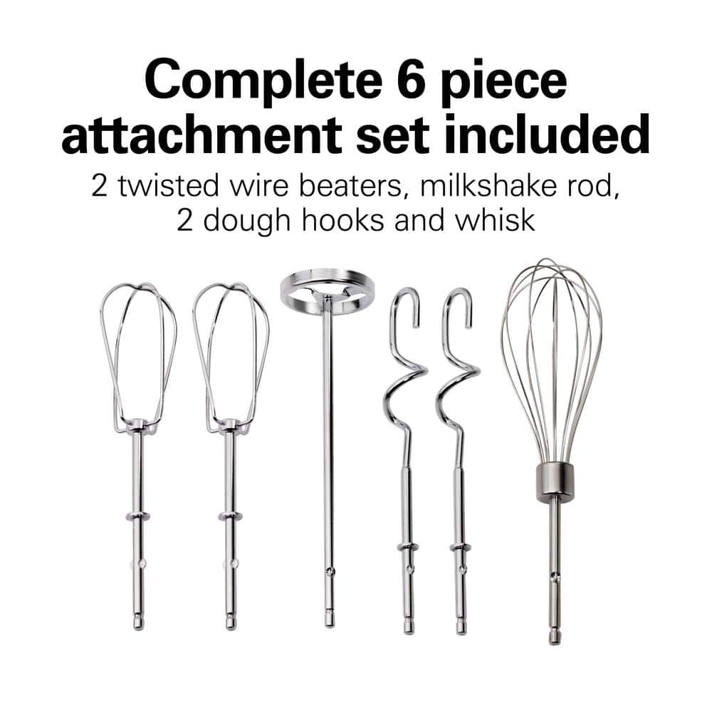 The Hamilton Beach 6 Speed Performance Hand Mixer with Snap-On Case comes with everything you need for a wide variety of mixing jobs: 2 twisted wire beaters, a milkshake rod, 2 dough hooks and a whisk. For easy storage, the snap-on storage case neatly holds all 6 attachments to reduce the chance that they're lost or misplaced. The attachments will always be on hand when you need them. This versatile hand mixer has 6 speeds and a QuickBurst button that gives you an extra burst of power at any speed. The Hamilton Beach 6 Speed Performance Hand Mixer with Snap-On Case has 290 watts of peak mixing power to easily get the job done, whether you're mixing cookie dough, whipping fresh cream or kneading bread dough. You'll have more control on the lowest speed with the pulse function, which helps prevent messy splatters as you mix. When you're finished mixing, the convenient eject trigger makes it quick and easy to remove the attachments, which are dishwasher safe for easy cleanup.