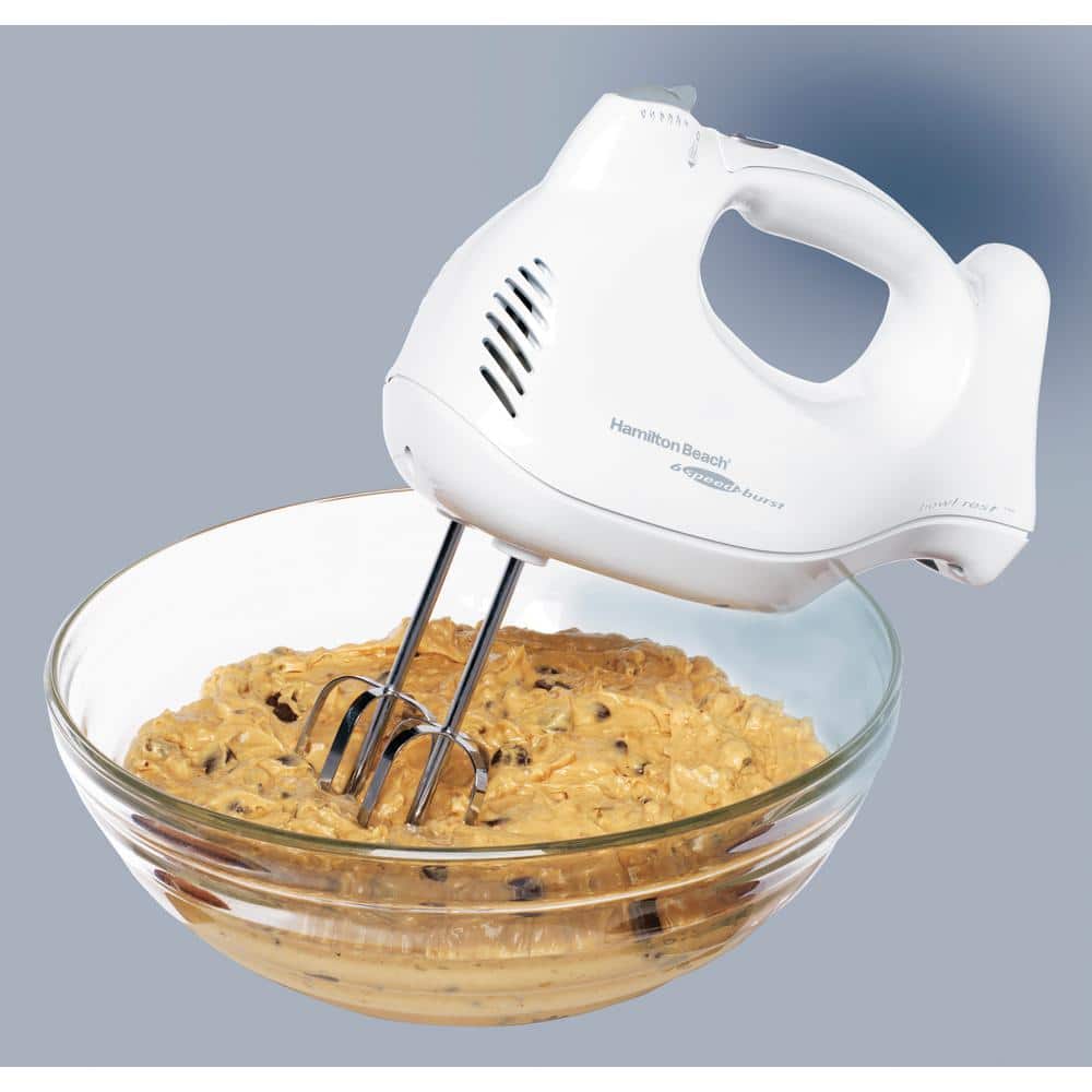 With the Hamilton Beach Power Deluxe 6 Speed Stand Mixer, you get two products in one space-saving appliance. Mixing a batch of bread or cookie dough. Let the stand mixer do the work. Whipping up a quick dressing. Unlock the hand mixer from the base for the fast results you want. The stand and hand mixer has a powerful 275-Watt peak power motor for all your mixing needs. As you mix, the Shift and Stir bowl rotating lever lets you rotate the bowl from side to side for thorough mixing. The Bowl Rest feature stabilizes the hand mixer on the side of the bowl to reduce messy drips and free your hands to add ingredients. The mixer includes 5 dishwasher safe attachments: 2 traditional beaters, a whisk and 2 dough hooks. Easily handle a wide range of mixing jobs with 6 speeds, and the Quick Burst button provides an extra burst of power at any speed. The durable 4 qt. (3.8 in. L) clear glass bowl makes it easy to see ingredients as they mix.