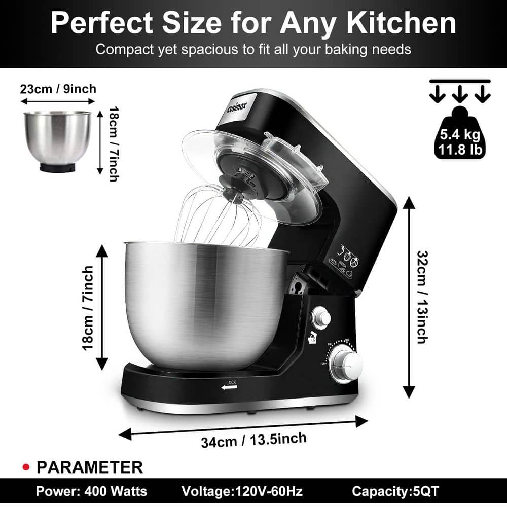 Our 5 Qt. Electric Stand Mixer is designed for hands-free mixing for a wide variety of foods ranging from light egg whites to sticky bread dough. Featuring powerful motor, our kitchen mixer is great for all mixing needs, help you baking or cooking freely and easily. On-slip suction feet and heat dissipation design on bottom for safe use. Speed from min to max let you whisk cream, mix potatoes or knead dough for bread and etc. in precise speed. This is an extremely popular stand mixer not only for baking lovers but also for professional chef.