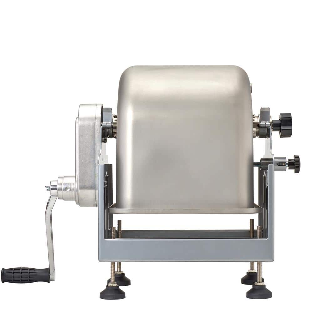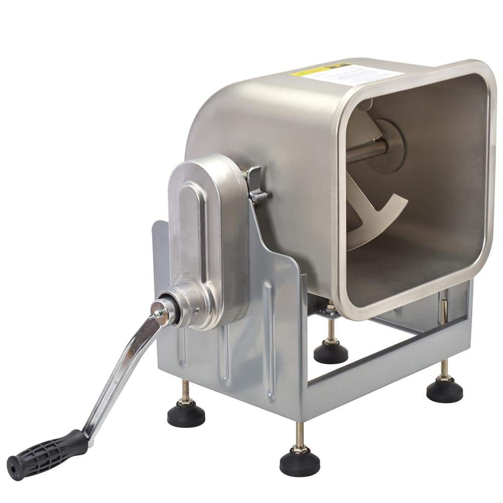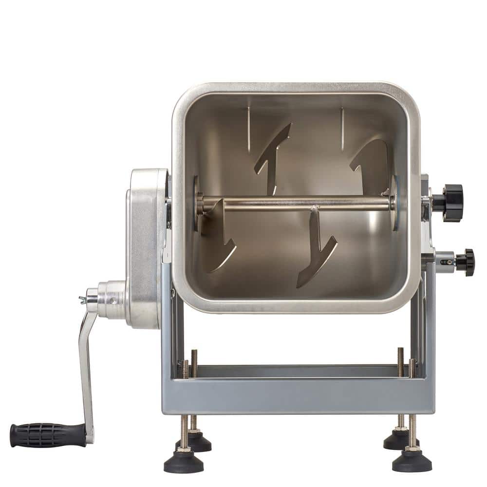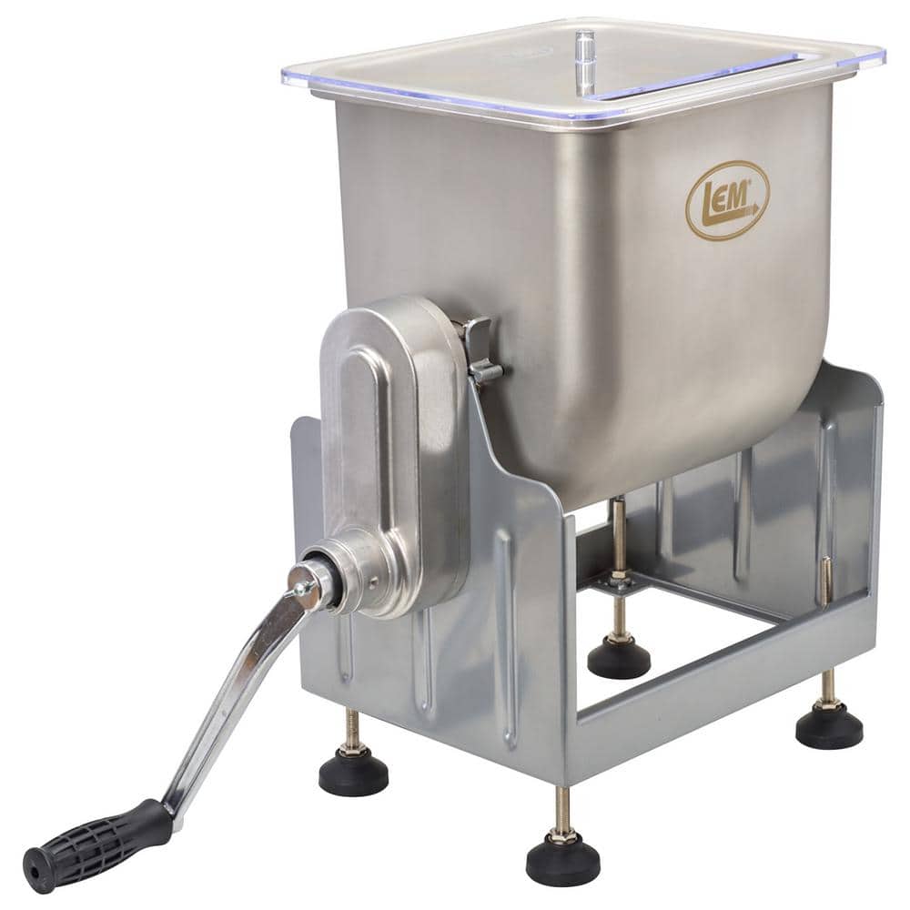Upgrade your food processing routine with a heavy-duty mixer that is everything you need to mix your favorite ground meats. The BigBite 25 lbs. Capacity Tilt Meat Mixer is perfect for hunters, food processors, chefs, and culinary enthusiasts who desire to make their own foods. This mixer's unique tilt feature allows easy unloading and filling. The meat tub has three locking positions: 90° for easy unloading, 115° easy filling, and 180° for storage. When attached to a grinder motor, the step-gear allows the grinder to run at its normal speed or slow down, ensuring a thorough mix. Please note that the grinder/motor is NOT included. The adjustable skid-resistant feet provide stability on any surface, and the fully removable meat tub is seamless stainless steel for better mixing and makes cleaning up after your food prep easier. Includes a clear acrylic cover and crank handle. This 25 lb. mixer works with our 8-BigBite Meat Grinder or larger, manufactured after 2009, or can be operated manually. For optimum mixing performance the mixer tub should be at least filled over the axel with paddles, approximately 20-23 lbs. of meat.