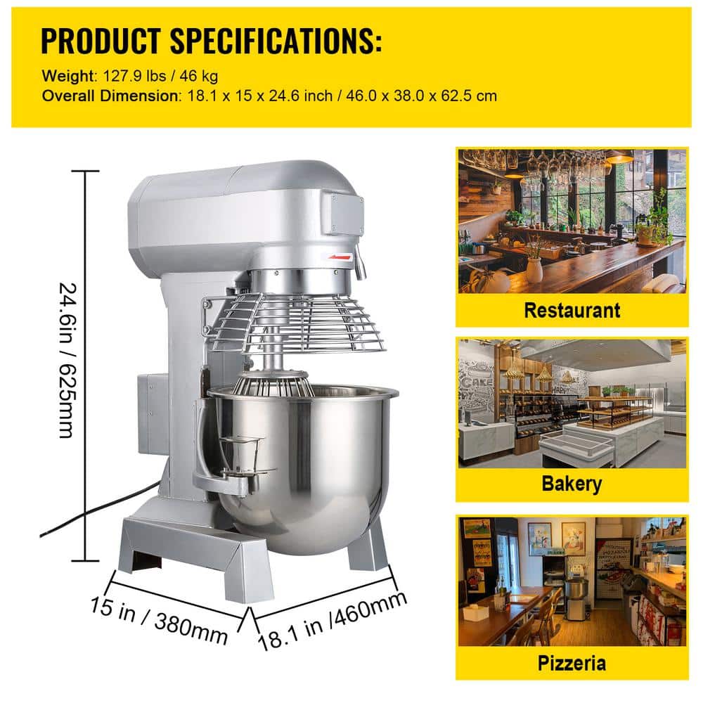 10 qt. Commercial Food Mixer Versatile and User-Friendly Our stand mixer features a 10 qt. bowl for large-scale mixing. The food-grade stainless steel parts are durable. It has a powerful motor with 3 adjustable speeds. 3-stirrers are included. Detachable for easy cleaning, adjustable bowl height, and a security guard for safety. Ideal for cooking lovers. High-Quality & Large Capacity, Detachable Attachments, Adjustable 3-Speeds, Protective Feature.