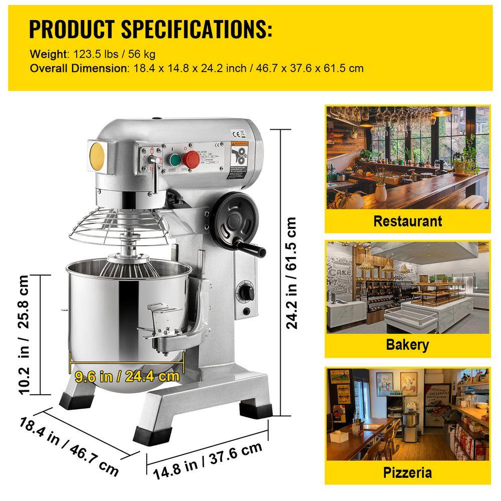 10 qt. Commercial Food Mixer. Powerful Stand Mixer with 3 Speeds and Detachable Parts for Easy Cleaning. Designed to handle large batches, this 10 qt. commercial food mixer provides a reliable solution for all your mixing needs. Crafted with food-grade stainless steel, it is durable and built to last. The powerful motor offers three adjustable speeds, giving you precise control for various tasks. This mixer comes with three versatile stirrers to tackle everything from dough to batters. With features like a timer function, adjustable bowl height, and easy-to-detach parts, it's perfect for both commercial kitchens and home chefs looking to elevate their cooking experience. Large Capacity, Powerful Performance, Durable Construction, Easy to Clean, User-Friendly.