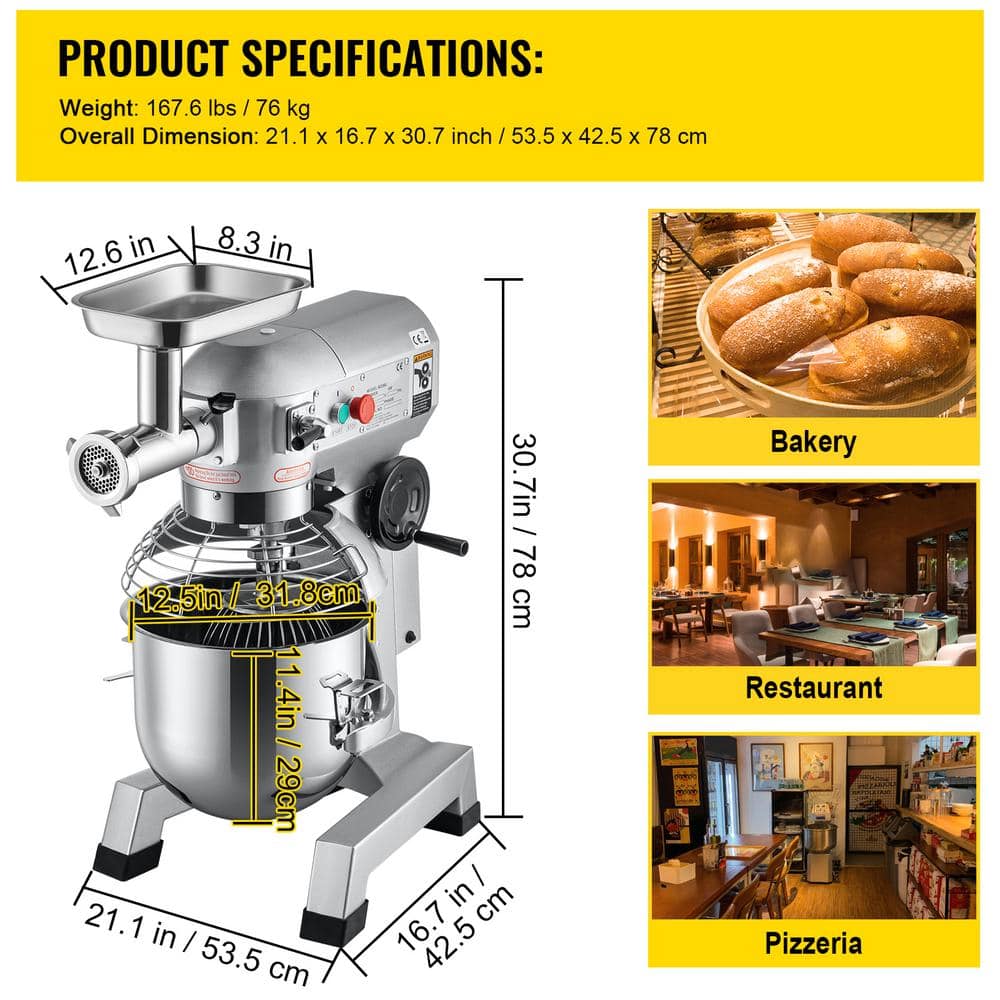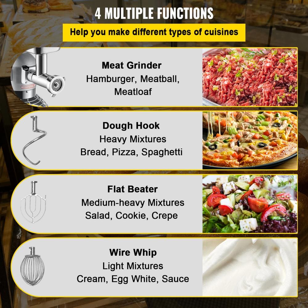 20 qt. Commercial Food Mixing Machine Versatile 2-in-1 Design with Adjustable Speeds for All Your Mixing Needs This multifunctional stand mixer features a generous 20 qt. bowl, perfect for handling large batches of ingredients. Crafted from food-grade stainless steel, its mixing components are durable and reliable. Powered by a robust motor with 3-adjustable speeds, this mixer also includes a meat grinding function and 3-mixing attachments for a wide range of culinary tasks. Designed for ease of use, the mixer boasts detachable parts, an adjustable bowl height, and a safety guard, making it an excellent choice for passionate home cooks and professionals alike. Versatile Machine, Spacious Bowl Capacity, Efficient Mixing System, User-Friendly Design.