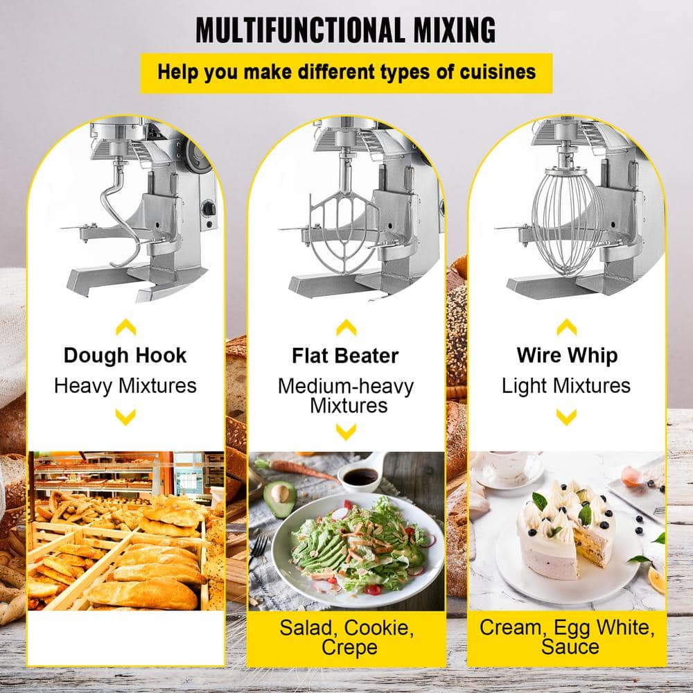Our VEVOR stand mixer has a 15 qt. bowl for mixing a large number of food at 1-time. The food-grade stainless steel mixing parts are sturdy and durable to use. It adopts a powerful motor with 3- adjustable speeds. 3-mixing stirrers are equipped for versatile use. Besides, it's easy to operate with timer function, detachable parts, the adjustable bowl height and a security guard. This food mixer is ideal for cooking enthusiasts.