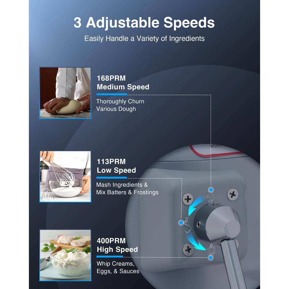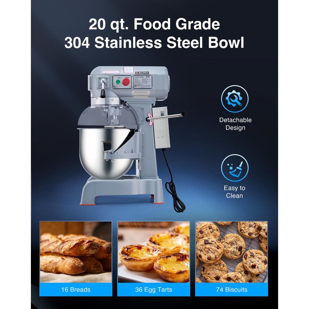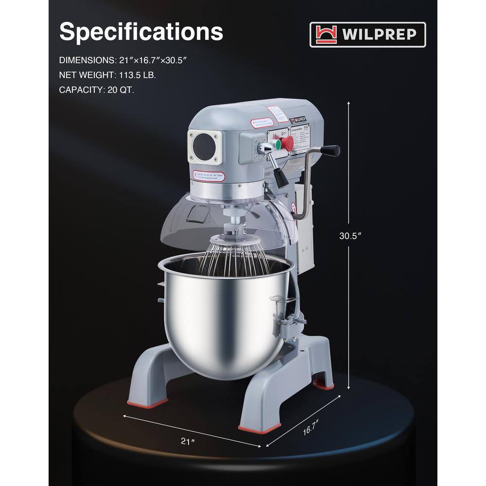 Wilprep 20 qt. 3-Speed Commercial Mixer, Stainless Steel Stand Mixer 750-Watt Commercial Food Mixer with Dough Hook Beater Whisk