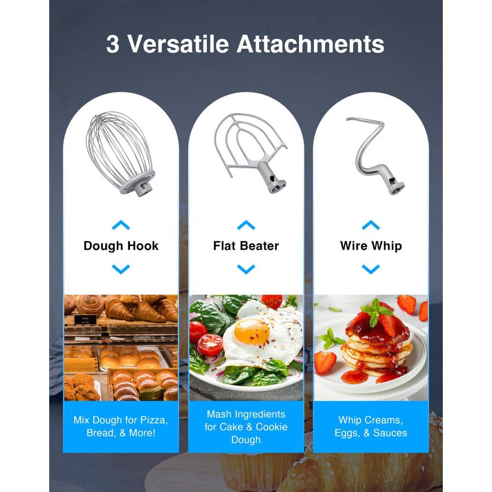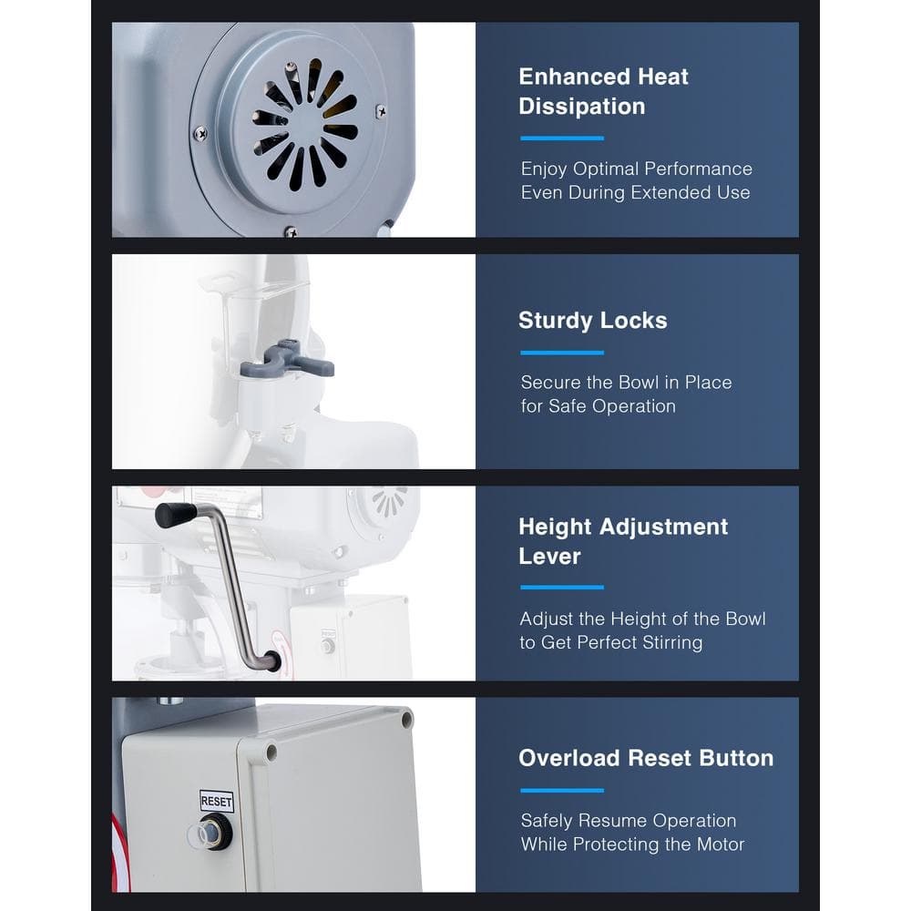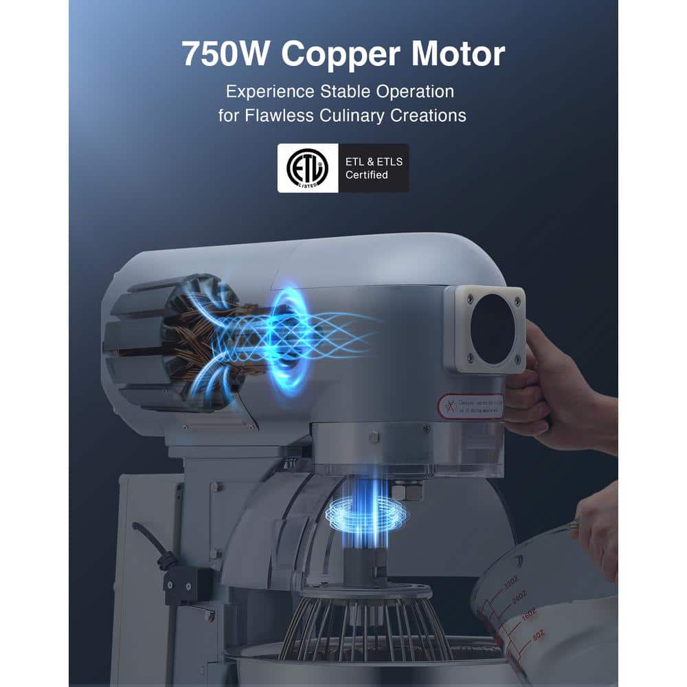 Still kneading, mixing, or beating food with your hands Get this time- and effort-saving electric food mixer to upgrade your kitchen and offer the most delicious baked goods to your customers, The 20 qt. food grade stainless steel bowl and impressive 750-Watt motor mean you can combine ingredients in a flash and say goodbye to all the tedious mixing process by hand. With 3 mixing speeds and an adjustable bowl height, chefs and bakers can quickly whip up mouthwatering creations in bakeries, pizzerias, restaurants, cafes, or even at home, Our dough mixer also comes with 3 different attachments to offer the very best multifunctional convenience. Choose this heavy-duty stand mixer for top-notch kitchen performance.