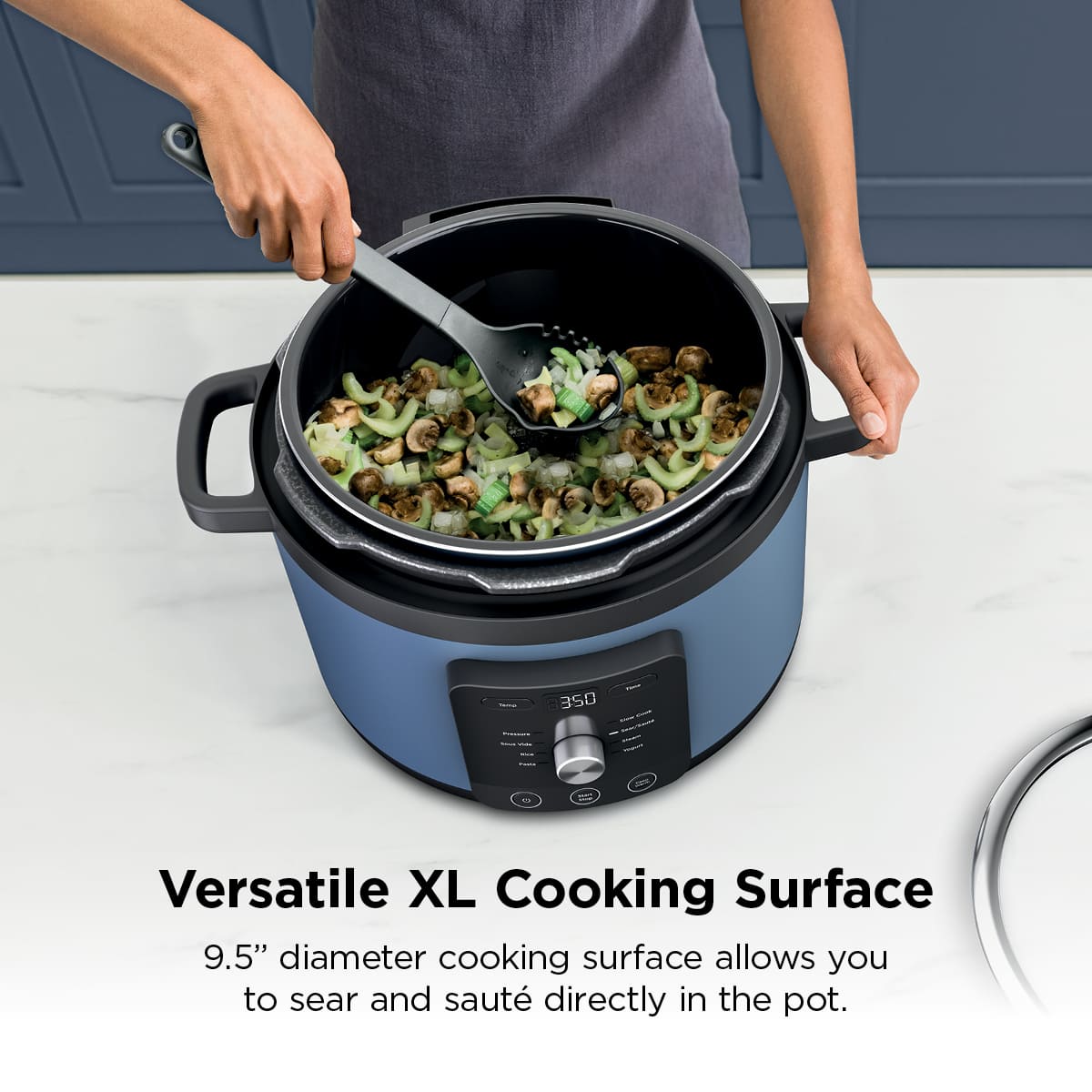 Meet the Ninja HyperHeat 6.5-qt Pressure Cooker. Designed for entertaining and everyday cooking, this versatile cooker features 9 programmable functions, including Sear/Sauté, Rice, Sous Vide, and more. Powered by a 1200-watt heating element, cook up to 2X faster than traditional slow cooking. The 9.5" diameter surface feeds up to 10 people, with a removable SimpliServe Pot for easy serving and cleanup.