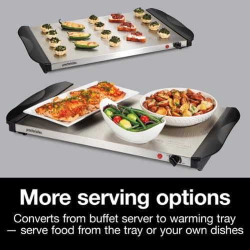 With the Proctor Silex Triple Buffet Server, you can serve warm food to family and guests during the holidays and other special occasions 3 different ways. Serve food from the 3 included oven-safe chafing pans — you can cook right in the pans. Serve appetizers, skewers, and finger-foods right from the large warming tray, or serve recipes that you've prepared in your own heat-safe casserole dishes and pans while they're kept warm on the electric warming tray. Each included chafing pan holds 2.5 quarts of food, perfect for main dishes and large sides. Each pan has a transparent domed lid, and convenient lid rests hold the lids open so guests can serve themselves without touching anything. The buffet server provides consistent, adjustable heat to keep food warm for hours without overheating. Easily adjust the temperature with a turn of the dial. Once set, the buffet server cycles on and off to maintain the right temperature. The handles stay cool to the touch so the buffet server can be lifted or moved while still warm, and the stainless steel pans are dishwasher safe for easy cleanup. The buffet server is durable and backed by a 3 year limited warranty.