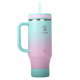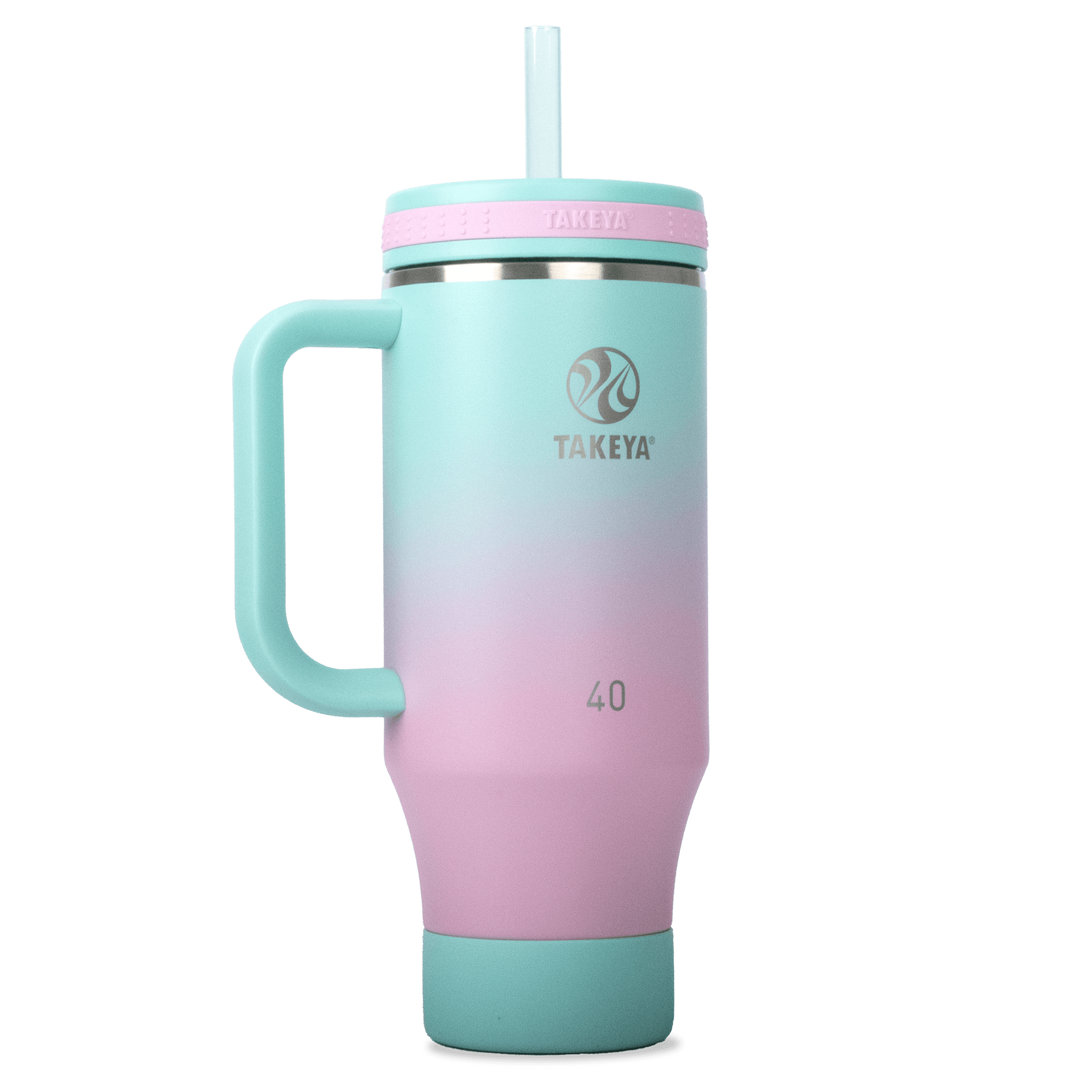 Featuring beautiful gradients and rich vibrant colors, Takeya's ombre collection adds a touch of California cool to the Takeya 40-oz. Straw Tumbler with Handle. This tumbler features double-wall insulation to keep your drinks cold for a full 24 hours, and the powder-coated finish makes it sweat-proof and easy to grip. The tapered bottom design easily fits in most cup holders and the ergonomic handle is made to comfortably hold in either hand, while the removable silicone bumper adds an extra layer of protection to ensure your tumbler stays in pristine condition. Whether you're sipping on iced tea, ice-cold drinks, or smoothies, the Takeya 40-oz. Straw Tumbler has you covered with two included straw sizes, Standard & Jumbo, because everyone has a preference!