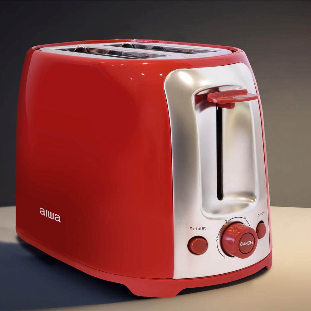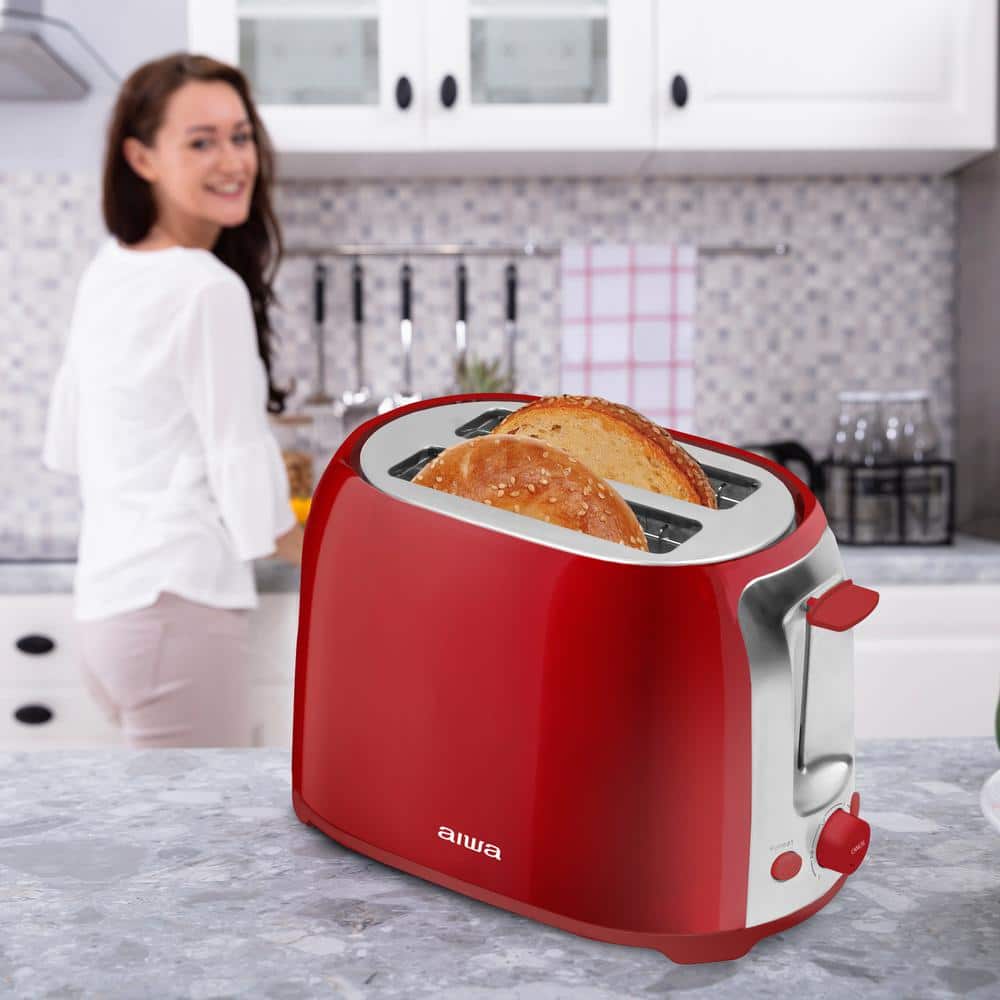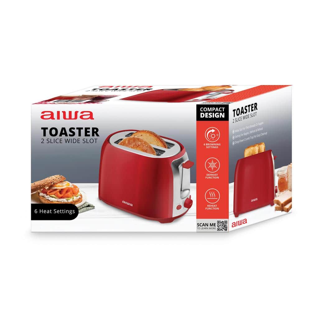 AIWA Red, 2 Slice Wide Slot, Toaster Reheat and Defrost Function, 6 Browning Settings, Drop Down Crumb Tray