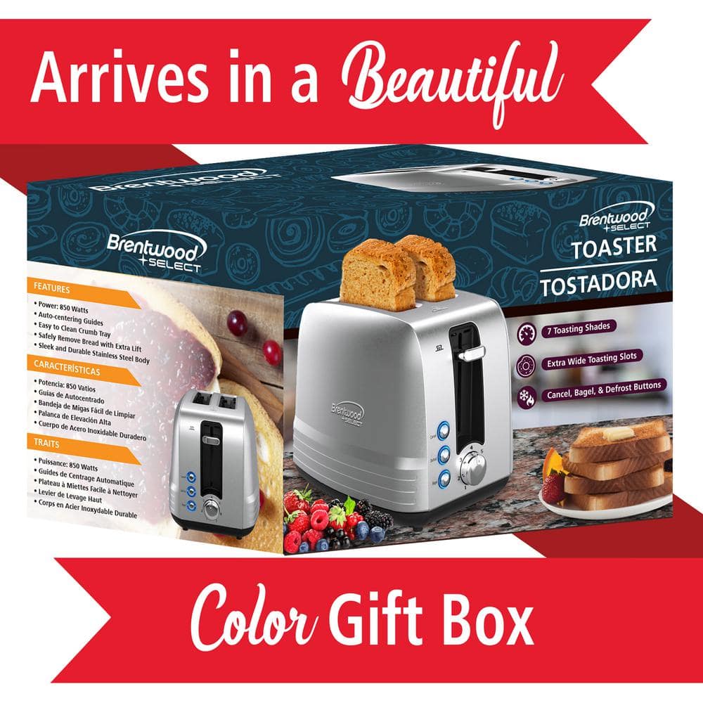 Use the Brentwood Select counter top toaster with extra wide slot to heat toast, bagels, waffles, pastries, and more. Features bagel, defrost, and cancel functions. Have full control with 7 shade settings, removable crumb tray, and extra lift lever. Slots are extra wide for bagels and artisan breads. Beautiful brushed stainless steel body for a sleek look that will go with most kitchen decor.