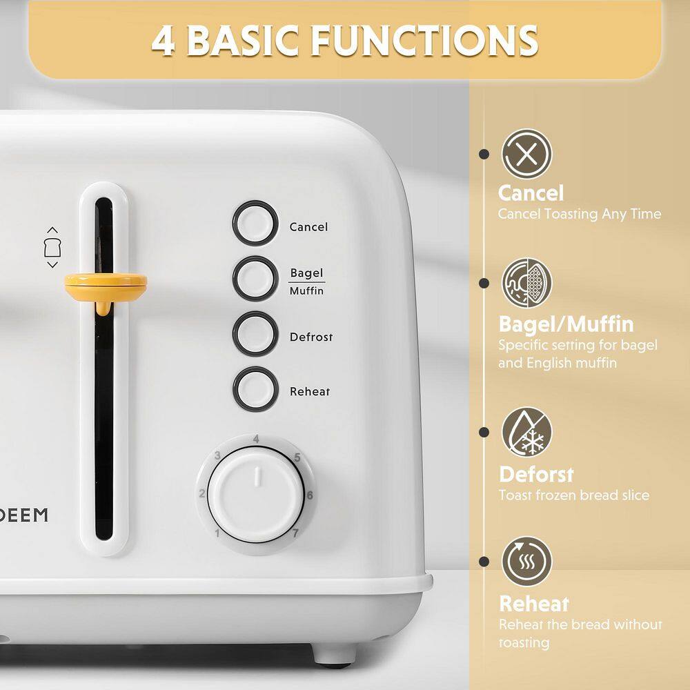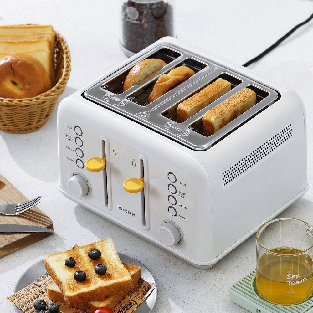 Buydeem toaster is designed with rich feature, bringing great convenience to your breakfast routine. Firstly, it comes with four extra-wide slots, allowing you to toast four slices of bread simultaneously. These slots are wider than standard, accommodating thicker slices or items like bagels with ease. Additionally, it features dual independent toasting controls, enabling you to adjust the toasting time and temperature separately for each pair of slots to cater to different preferences. During the toasting process, you can choose from 7 different shade control settings, ranging from light to dark, offering a variety of toasting options to suit your taste. What more, this toaster offers four preset programs, including cancel, bagel, muffin, defrost, and reheat. The cancel function allows you to interrupt the toasting process at any time, while the bagel mode adjusts the toasting settings to ensure perfect results for bagels. The muffin mode gently toasts, avoiding over-crisping. Finally, this toaster features automatic pop-up functionality, ejecting the toast automatically when done, and it comes with a high lever lift for easy retrieval of smaller items like english muffins without the risk of burning your fingers. Overall, this toaster is not only powerful in function but also user-friendly, making it the perfect companion for your breakfast needs.