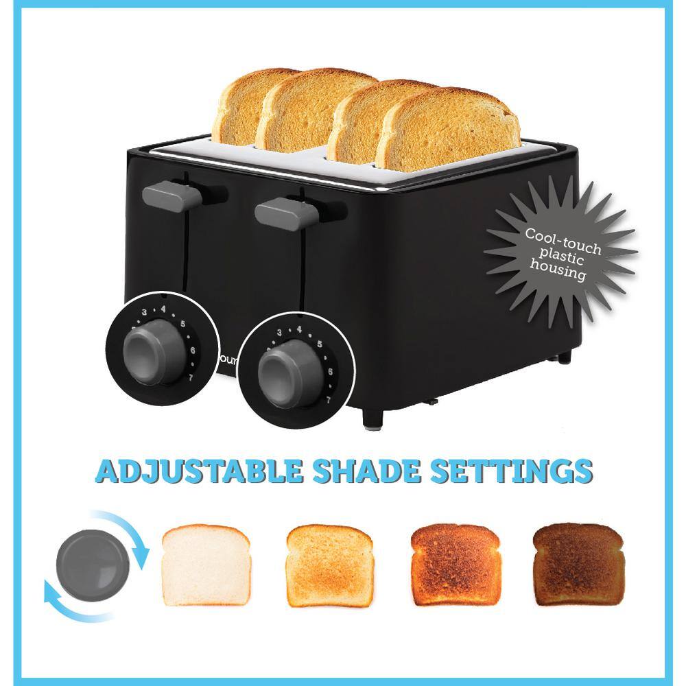 Add this four-slice toaster to your kitchen suite. With seven adjustable shade settings, you can make toast how you want it. The extra lift feature lifts bread slices for easy removal of any size slice, and the 11/4 wide toasting slots enable you to toast any kind of bread, thin or thick. For even toasting, it offers auto centering guides.