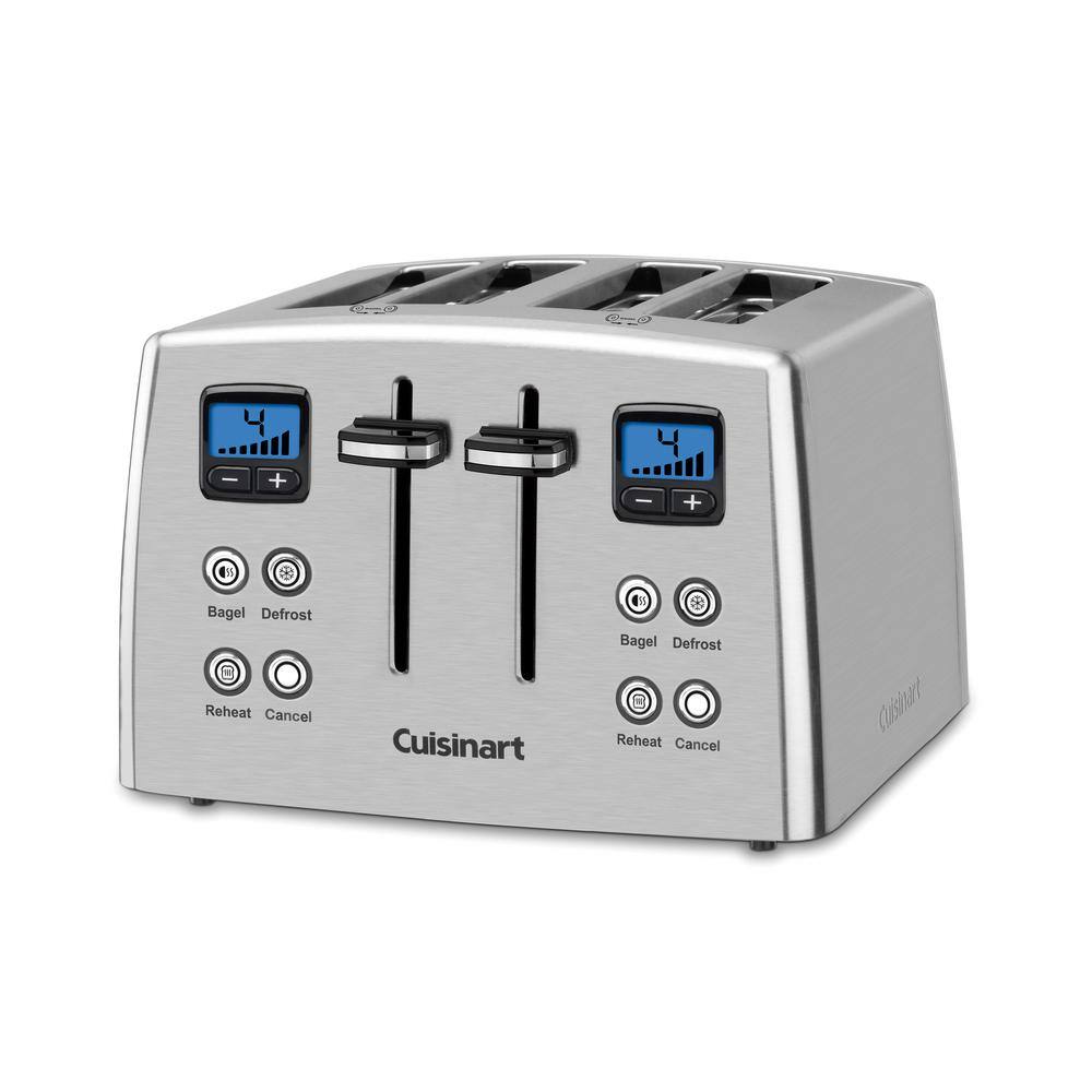 The stylish stainless CPT-435 4-Slice Countdown Metal Toaster by Cuisinart takes toasting to a whole new level. Separate controls defrost waffles before toasting, reheat toast without more browning and reduce heat on uncut side of bagels. 7-browning settings and self-adjusting slots mean thick and thin slices are toasted as desired. LCD countdown toasting-time bar display makes it easy to keep track. Perfect toast, English muffins, bagels and more.