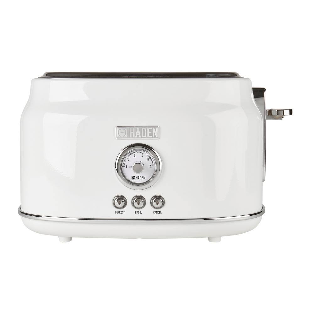 With its retro-chic lines, HADEN Dorset 2-Slice Ivory Toaster is made to impress This product is developed with the latest technology delivering power, efficiency and durability combined with great design. Featuring variable settings to ensure that your toasts or bagels are browned precisely to your liking, this product has a cancel setting that lets you stop the toasting cycle midway. A self-centering function automatically centers bread for a perfect result. Accommodating 2 slices of toast at one time and featuring extra-wide slots, this impressive unit can toast a range of breakfast foods, including thick-cut bread, bagels, buns, crumpets and more. Designed with convenience, the HADEN Dorset 2-Slice toaster has reheat, defrost and bagel functions, whilst the anti-jam feature allows easy toast removal. Aesthetically designed with rounded and retro style to fit contemporary and modern kitchens. This product can be paired with the HADEN Dorset Ivory Kettle to get an Incredible and elegant set.