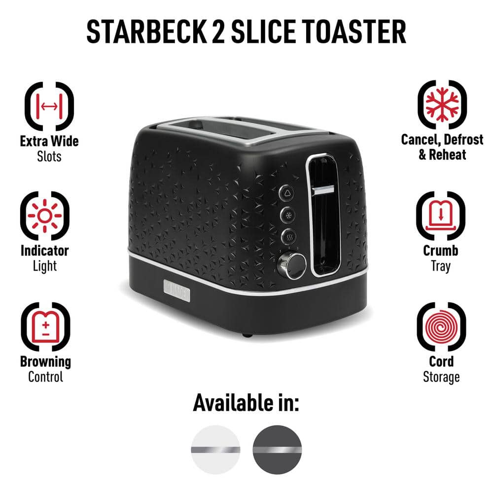 Elevate your breakfast routine with the stylish Starbeck 2 Slice Toaster in sleek black. This electric 2-slot wide-slot toaster can prepare bread or bagels. The HADEN Starbeck toaster features Cancel/Defrost/Bagel settings, a self-centering function, a removable crumb tray for easy cleaning and a retro browning control dial that allows you to select the perfect timing for your bread, English muffin or waffle. Whether you're more of a toasted bagel and cream cheese fan or a toasted bread and butter fan, this cute toaster has you covered when it comes to making a great-tasting toasted snack. Shop the full collection of HADEN appliances for more sleek kitchen gadgets like coffee machines, electric kettle and toaster sets, microwaves and more.