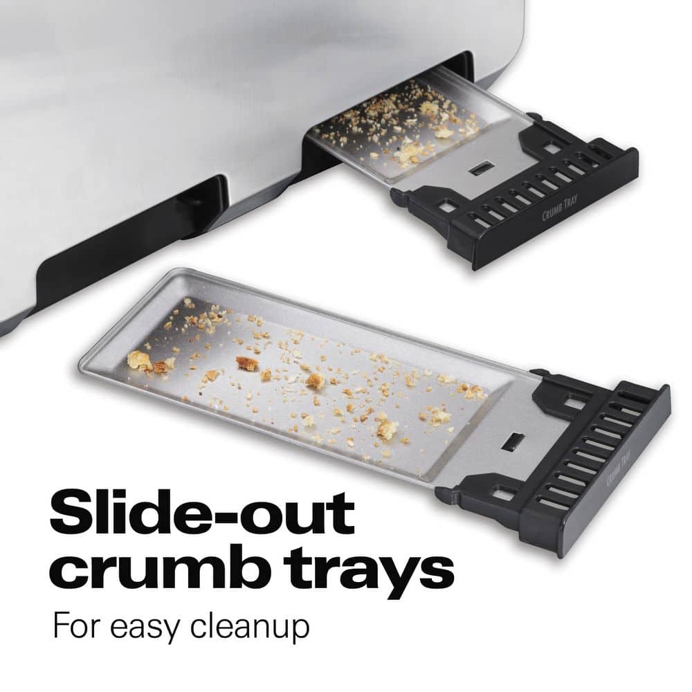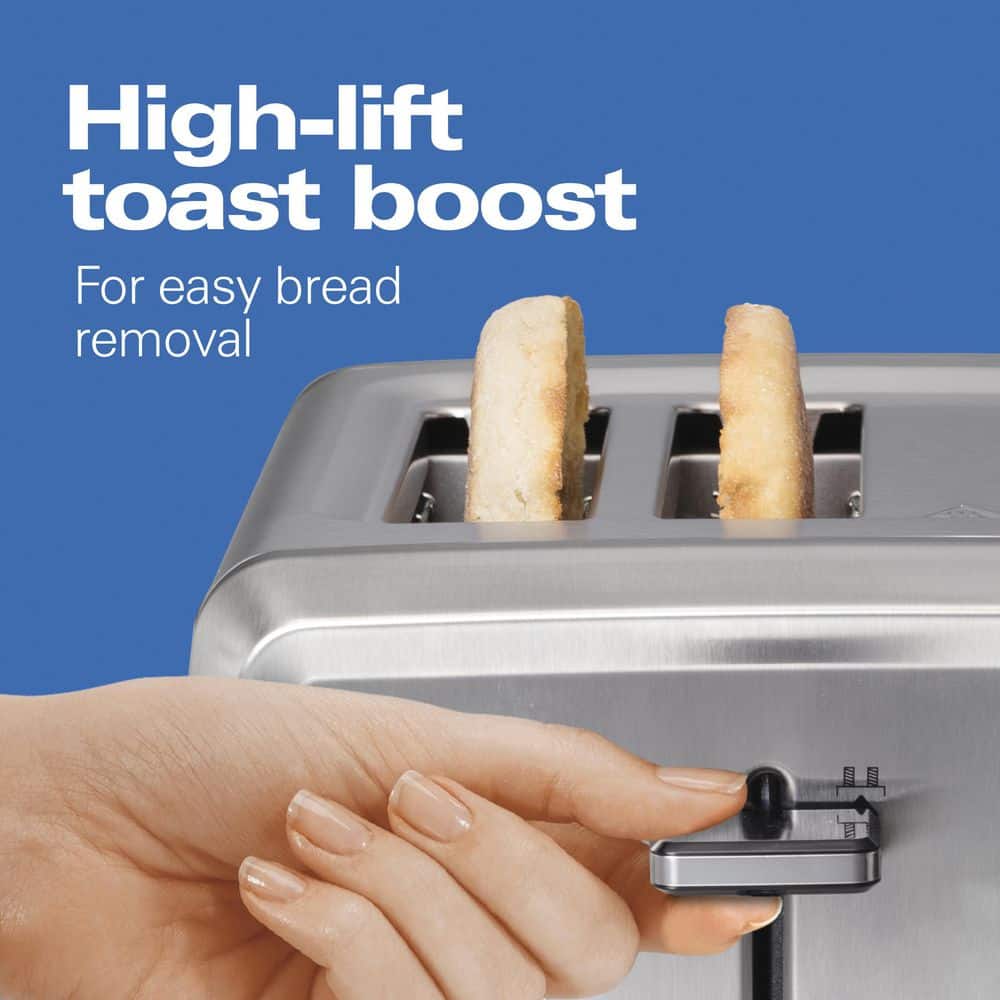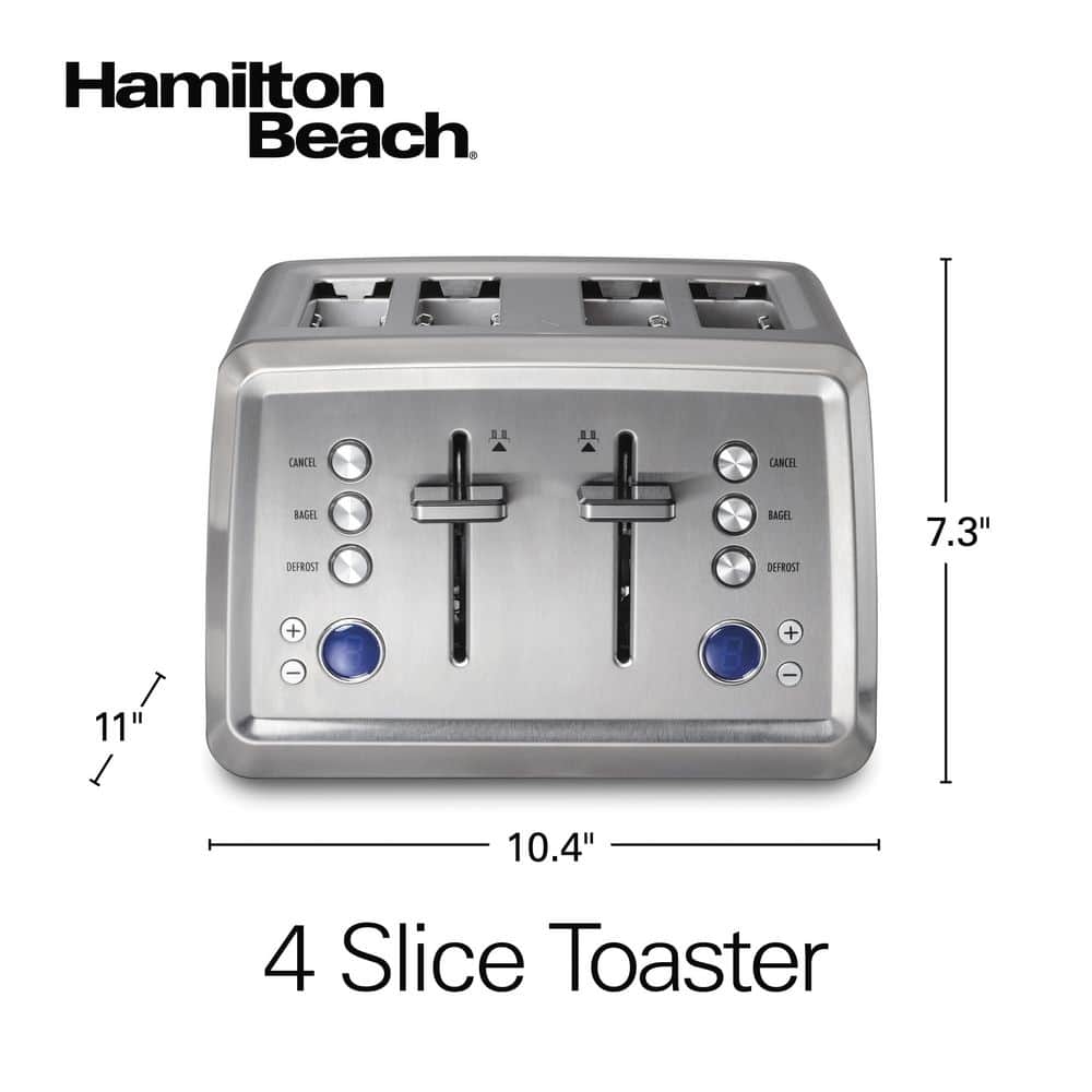 With the Hamilton Beach 4 Slice Digital Toaster, toasting slices of bread is only the half of it. Four extra-wide slots and a special bagel setting lets you toast the cut side of a bagel while warming the outside. Bring frozen waffles or pancakes to a warm, golden finish with the defrost button, which thaws and then toasts the food. And for smaller items, like English muffins, a toast boost feature gives breads a high lift for easy removal. The modern stainless steel design features a digital display that shows the selected shade at a glance, and easy-push buttons are highlighted with indicator lights. The slide-out crumb trays make cleaning easy.