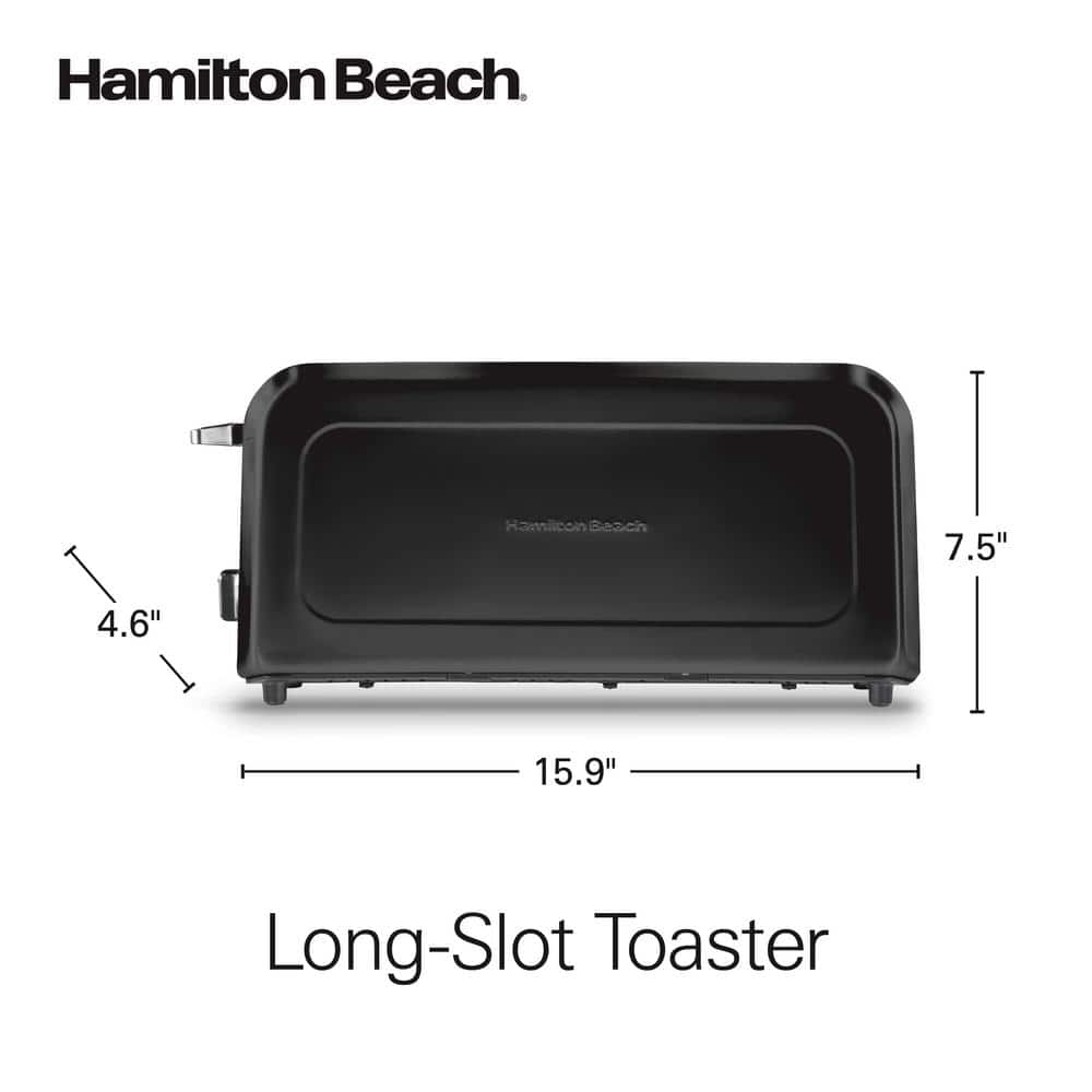 The Hamilton Beach Long-Slot Toaster has an extra-long, extra-wide 10" slot that fits two regular slices of bread or one long slice of artisan bread without needing to cut or flip it to toast both ends. Perfect for toasting rye, sourdough, rustic, and homemade bread slices, bagels, English muffins, frozen waffles and more. The long toaster slot has self-centering bread guides to evenly brown bread on both sides, whether you're toasting one or two slices. This versatile toaster has all the convenient features you've been looking for in a toaster. The bagel button extends the toasting time for bagels so they're warm and delicious every time, while the cancel button lets you stop the toasting cycle to get your toast. Toast Boost lifts smaller breads like English muffins and gluten-free slices so they're easier to retrieve after toasting. Make toast lighter or darker with 7 toast shades to choose from. Because of its slim design and premium cord storage, the toaster has a smaller profile that fits narrow spaces on your countertop and makes it easy to store. The toaster is easy to clean with a slide-out crumb tray, and the neutral color will look great in any kitchen.