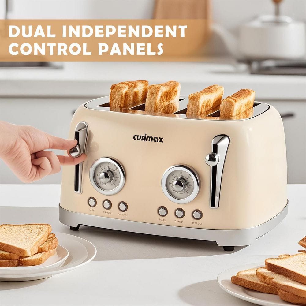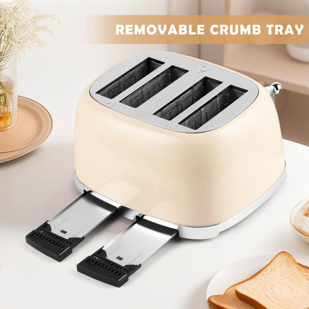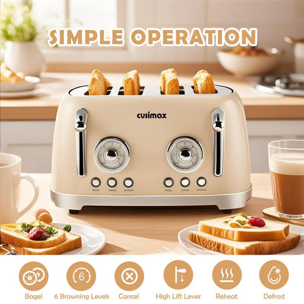 JEREMY CASS 4-Slice Beige Wide Slot Toaster with 6 Toast Settings and 4 Functions, Dual Independent Control Panels