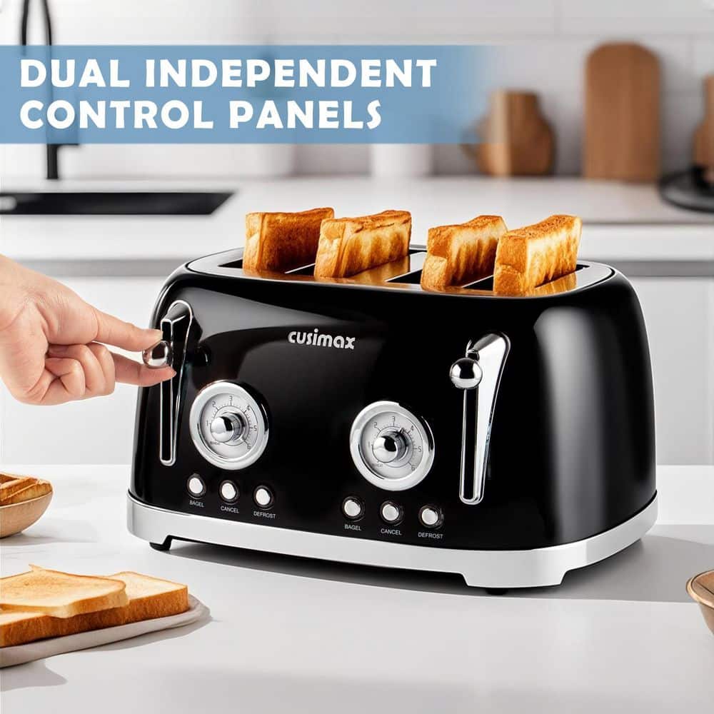 JEREMY CASS 4-Slice Black Wide Slot Toaster with 6 Toast Settings and 4 Functions, Dual Independent Control Panels