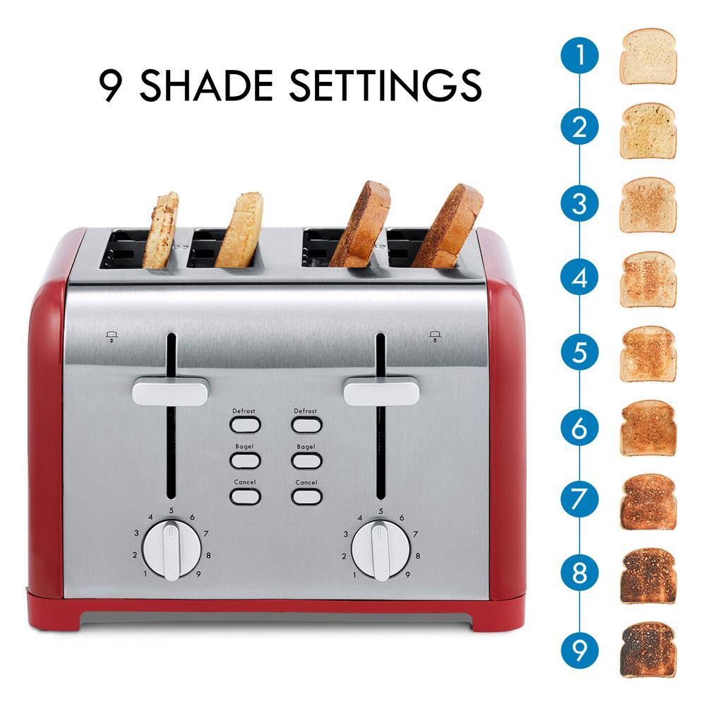 Toast or defrost your way to a delicious healthy breakfast! This 4-slice toaster features high-lift levers, dual controls and 9 shade settings. Extra-wide slots and self-adjusting bread guides fit anything from English muffins to Texas toast.