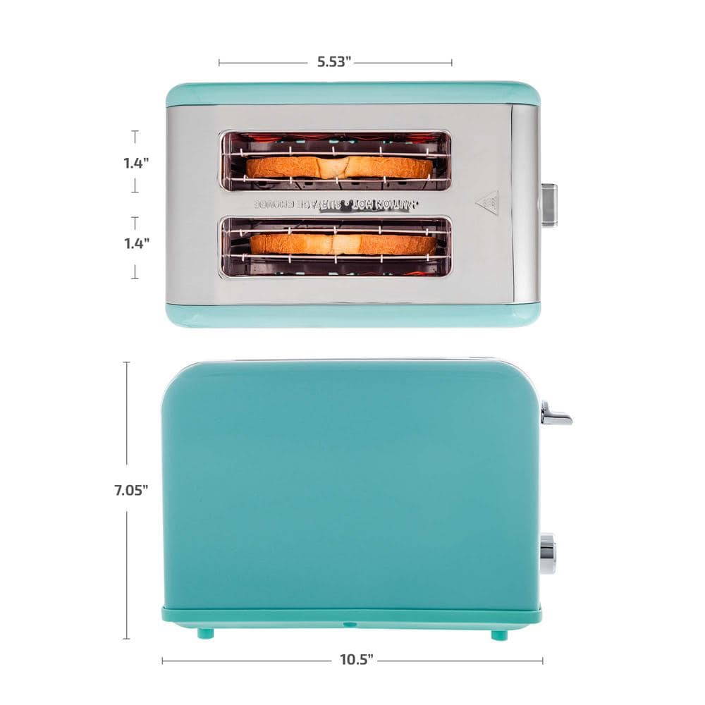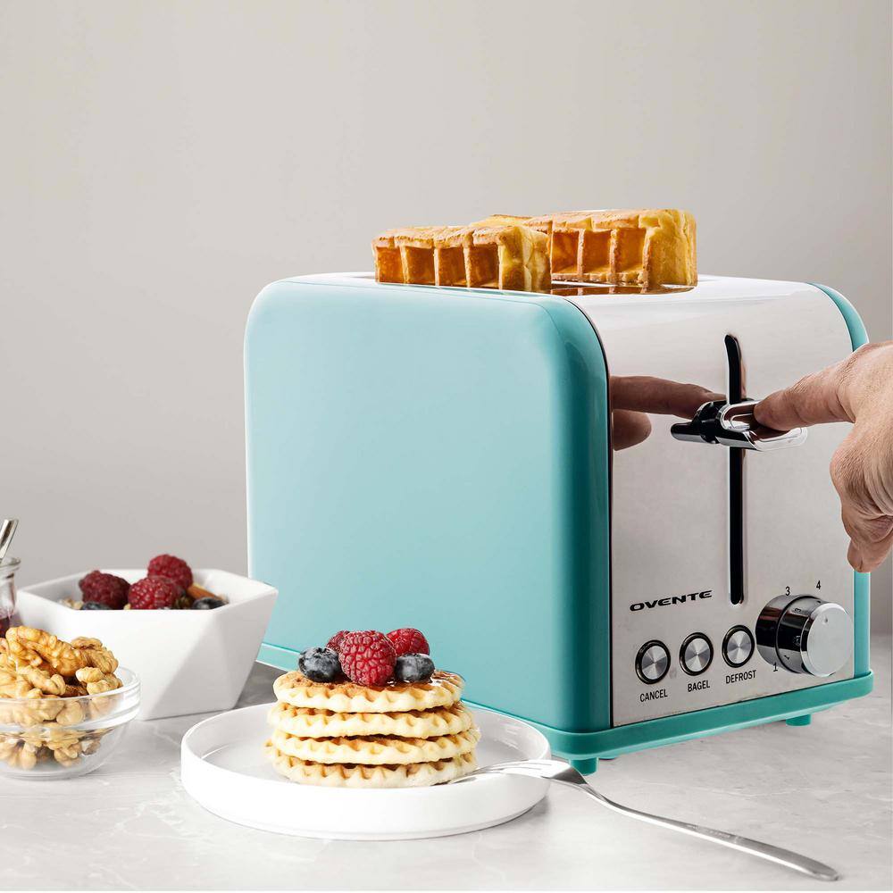 Keep Things Quick and Easy.Upgrade to a stylish kitchen by adding this beauty to your countertop. The Ovente TS2450T 2-Slice Toaster comes in a sleek turquoise color that brings that pop of color into your kitchen. Enjoy a wide variety of your favorite breads with the large toasting slots which can accommodate longer, rectangular slices of bread such as sourdough or other artisanal loafs.The Ovente TS2450T toaster is compact which saves space, and can fit any kitchen counter or even dorm room. Very convenient and easy to use, with a 6-Setting Control Knob that allows you to customize how you want your toast. Need your bread in a hurry? This toaster comes with the convenient Defrost and Bagel push buttons, perfect for people on the go. Simply push down the lever to start toasting, and press the Cancel button to stop toasting anytime. With a durable stainless steel housing, you can rest assured that you will be toasting in style with the Ovente TS2450T toaster for a very long time.
