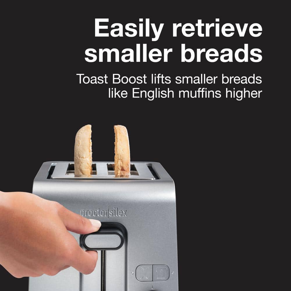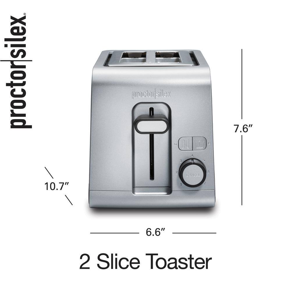 The Proctor Silex 2-slice Toaster is the durable, high-quality, user-friendly toaster you've been looking for. It has all the great features you want to perfectly toast your favorite breads, without extras you don't need. Every feature on this toaster has been thoughtfully designed in. for high performance and convenience. It has simple, intuitive controls, and fewer parts to wear out, to efficiently toast bread in your kitchen-year after-year. It's even backed by a lengthy 3-year limited warranty. Sure-Toast One-Slice technology ensures every-slice of bread you toast looks as good as it tastes. Sure-Toast evenly toasts both sides of bread, whether toasting 1 or 2-slices. Say goodbye to toast burnt on 1-side and under-cooked on the other. The bagel function perfectly toasts bagels with a crunchy cut side and soft, warm rounded side. Toast Boost lifts smaller breads higher so they're easier to retrieve, while extra-wide slots fit thicker breads like Texas toast and bagels. The front-access, pullout crumb tray makes cleanup easy, and the shade selector has 7 toast shades and integrated cancel button. This must-have toaster looks great too - with a timeless design, clean lines and curves, that are always in style.