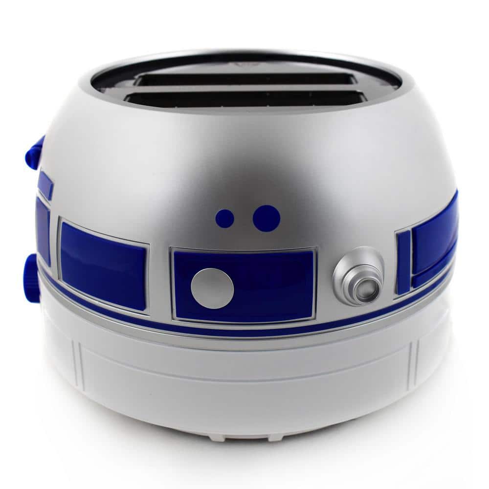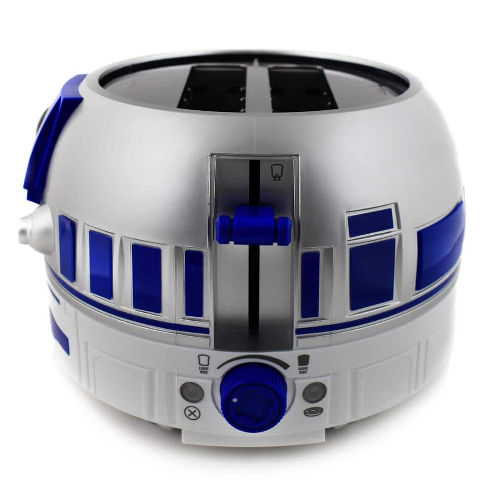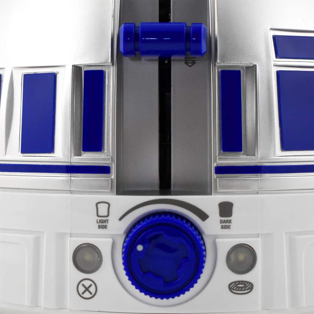 Uncanny Brands Star Wars R2-D2 Deluxe Toaster - Lights-Up and Makes Sounds Like Artoo R2-D2 saved the galaxy; now it can save breakfast. The ultimate gift for Star Wars fans, our exclusive R2-D2 toaster is a lively kitchen companion. Simply insert the bread, press the lever, and Artoo's lights and sounds activate while toasting. Like toast on the dark side. Use the handy dial to adjust browning. R2-D2 chirps and blinks in a 10-second sound sequence when toasting. Holographic projector illuminates the toaster body during toasting. 2 wide slots accommodate bagels, English muffins and thick breads. Shade selector dial from light to dark. Bagel and Cancel buttons. Removable crumb tray for easy cleaning. BPA-free. and 2020 Lucasfilm Ltd. All rights reserved.
