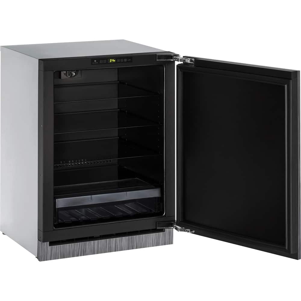 Adjust the four tempered glass shelves of this U-Line refrigerator for customized storage. The interior LED lights turn off when the door closes for energy conservation, or it can be programmed to stay on for three hours to Illuminate unit contents. This U-Line refrigerator has a removable crisper drawer for easy cleanup.