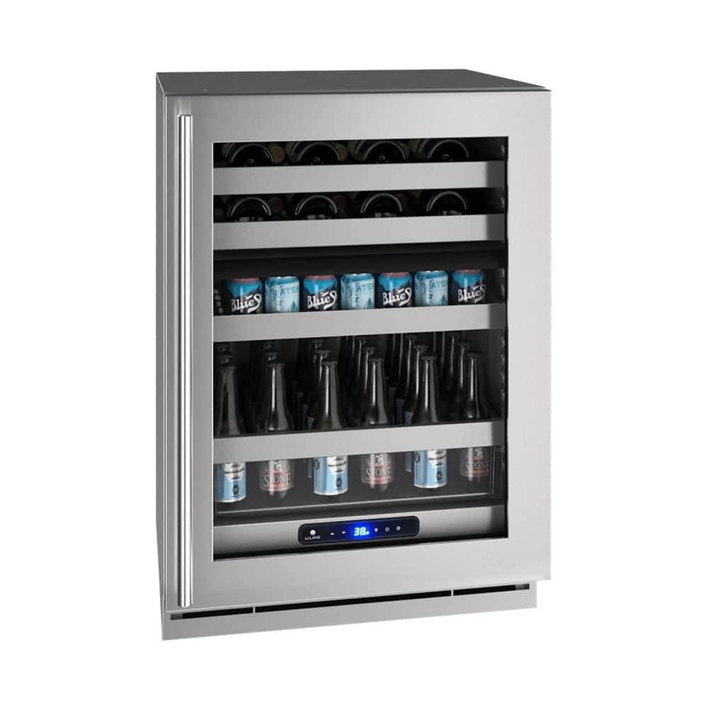 Chill favorite wines and beers with this 24-inch U-Line dual-zone beverage center. A variable speed compressor delivers quiet operation, maximum energy efficiency and quick temperature response, while the convection cooling system provides quick cool down and consistent temperature. This sizable U-Line dual-zone beverage center holds up to 14 wine bottles and 72 cans, providing plenty of storage space.