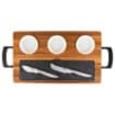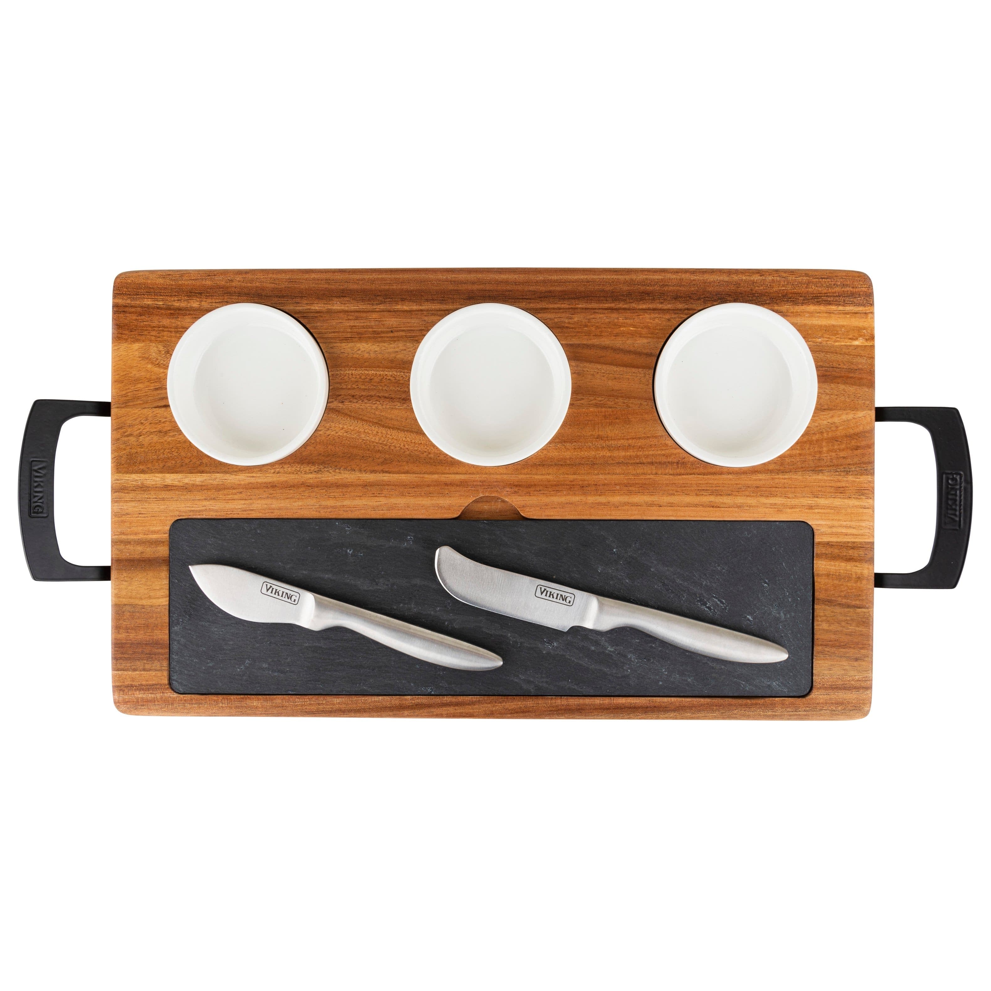 The Viking 7pc Acacia & Slate Charcuterie Board Set is an elegant way to impress your guests by serving a variety of appetizers on one board. The set includes a heavy-duty, sustainable, Acacia wood butcher block style serving board with ergonomic metal handles that make it easy to carry and maneuver. Three, 3.5” ceramic ramekins sit into recessed holes on the board for dips, dried fruits, olives, nuts, gherkins, grapes, sauces, super soft cheeses, and anything else you may want to add to your presentation. Each ramekin bowl holds about 3 ounces. The slate board is removable and perfect for both hard and soft cheeses and meats. You can even write the name of the cheese on the slate board with chalk (not included) so that your guests know the different types of cheeses you are offering. Underneath the slate board are two multi-function stainless steel cheese knives that are designed for both cutting hard cheeses as well as spreading soft cheeses and other spreads. The ceramic ramekins and knives are dishwasher safe. The slate board should be hand washed with warm water and soap and then immediately dried. Do not soak the board or slate. Maintain the serving board as you would any cutting board by periodically applying food-grade mineral oil to the board. If you need to wash the board, it can be wiped clean with a damp cloth. Because the knives are conveniently stored under the slate board, we encourage you to use caution when moving the board so that the slate piece and ramekins don’t fall out during movement or storage.